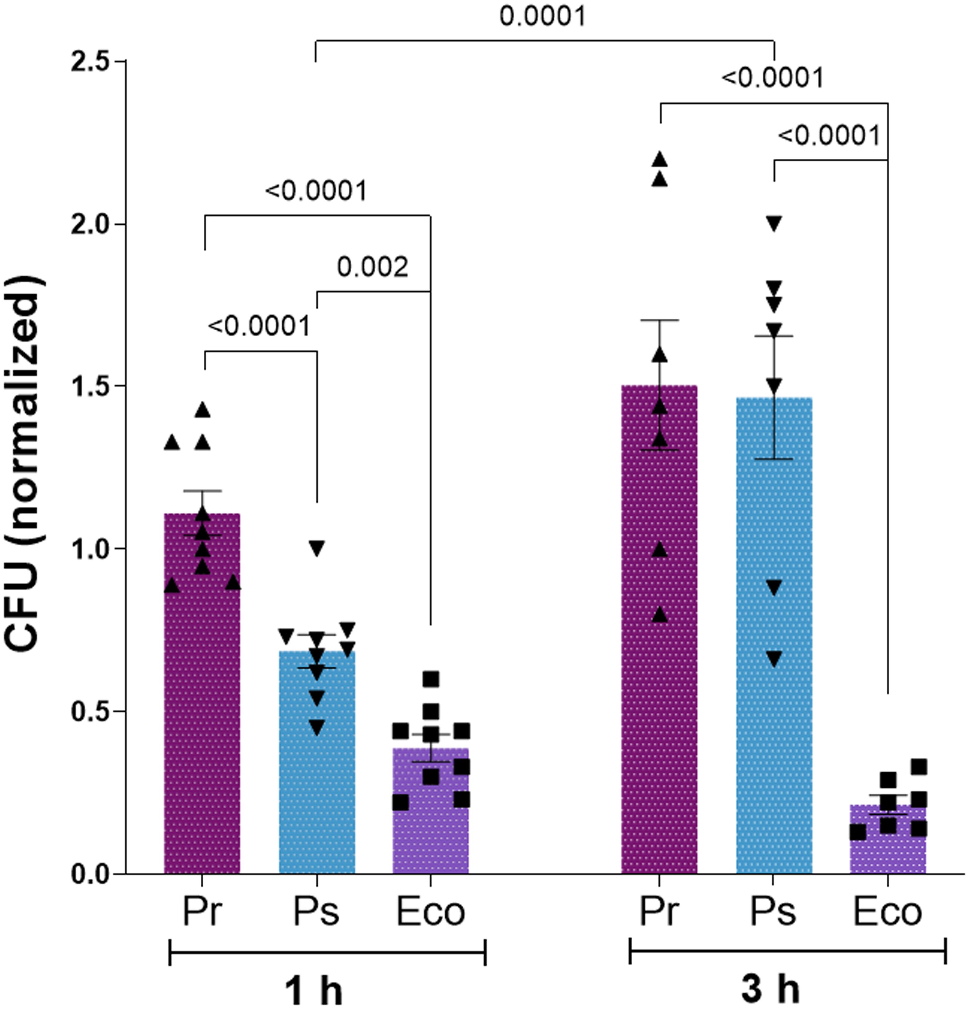 Figure 1. Pr and Ps subvert PMN-mediated killing. Pr, Ps or Eco were left alone (CFU – PMN) or were incubated in the presence of PMN in a bacteria:PMN ratio of 1:1 (CFU + PMN) for 1 or 3 h. Colony forming units (CFU) were determined in each sample and values normalized as described in Materials and Methods. All results were expressed as the mean ± SEM; each point represents a different PMN donor. Data presented a normal distribution according to the Shapiro-Wilk normality test, and comparisons were performed using one-way ANOVA followed by the Tukey´s post-test for multiple comparisons.