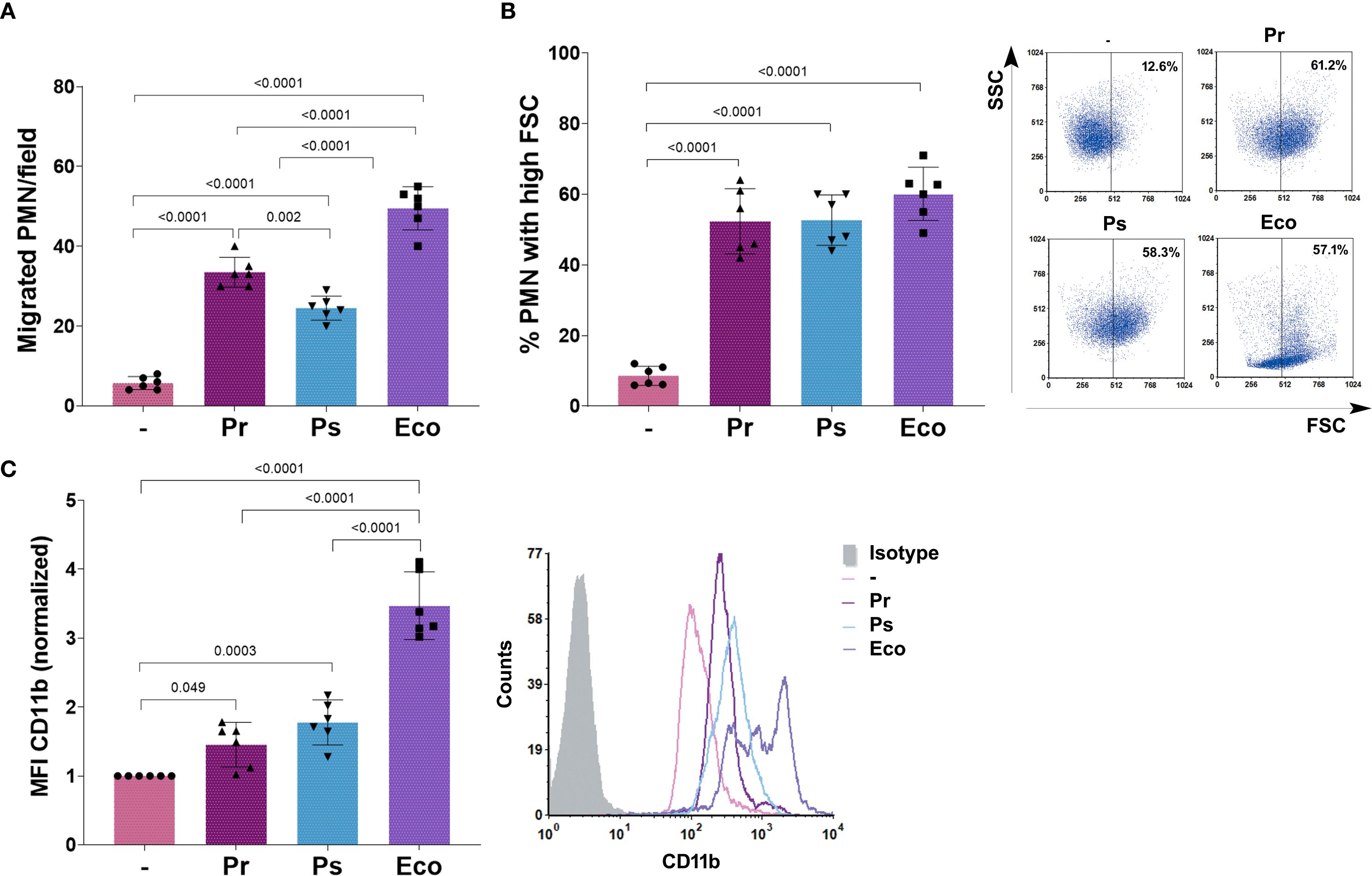 Figure 2. Pr and Ps are recognized by PMN. Pr, Ps or Eco were incubated with PMN in a bacteria:PMN ratio of 10:1 for 30 min. All results were expressed as the mean ± SEM; each point represents a different PMN donor. In all cases, data presented a normal distribution according to the Shapiro-Wilk normality test, and comparisons were performed using one-way ANOVA followed by the Tukey´s post-test for multiple comparisons. (A) Number of PMN/field that migrated toward the chemotactic stimulus (bacteria). (B) % of PMN that increased their Forward Scatter (FSC) determined by flow cytometry. Right panel: representative dot-plots showing SSC versus FSC profiles of PMN without treatment (–), Pr, Ps, or Eco. (C) Expression of CD11b determined by flow cytometry. The values of the mean fluorescence intensity (MFI) of CD11b were normalized to the values obtained for unstimulated PMN (–) as described in Materials and Methods. Right panel: Representative histograms of the expression of CD11b in the different experimental groups.