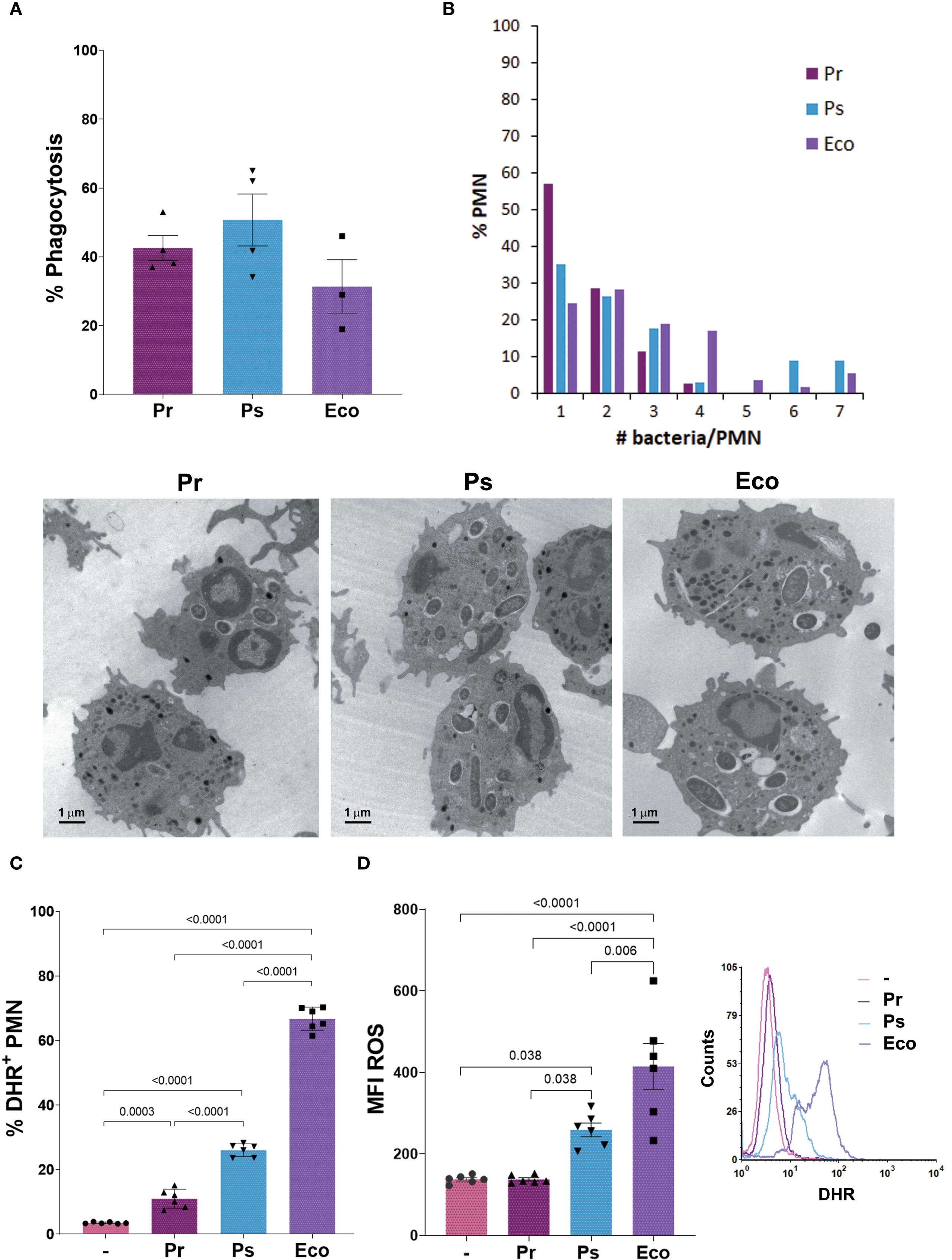 After initial contact with bacteria, PMN must ingest microorganisms to kill them intracellularly by triggering the production of reactive oxygen species (ROS). In this sense, we first evaluated whether Pr and Ps were phagocytosed by PMN. For this, we measured the percentage of PMN with ingested bacteria by transmission electron microscopy (TEM) after 1 h of incubation. As Figure 3A shows, the percentage of PMN with intracellular bacteria (% Phagocytosis) was similar for Pr, Ps, and Eco. However, when the number of bacteria inside PMN was counted, we found that the percentage of PMN with<2 bacteria per PMN predominates for Pr, but for Ps and Eco PMN with 6 or 7 bacteria were also observed (Figure 3B), indicating that even if the % of PMN that ingested bacteria was similar for all groups, less Pr was internalized compared to Ps or Eco.