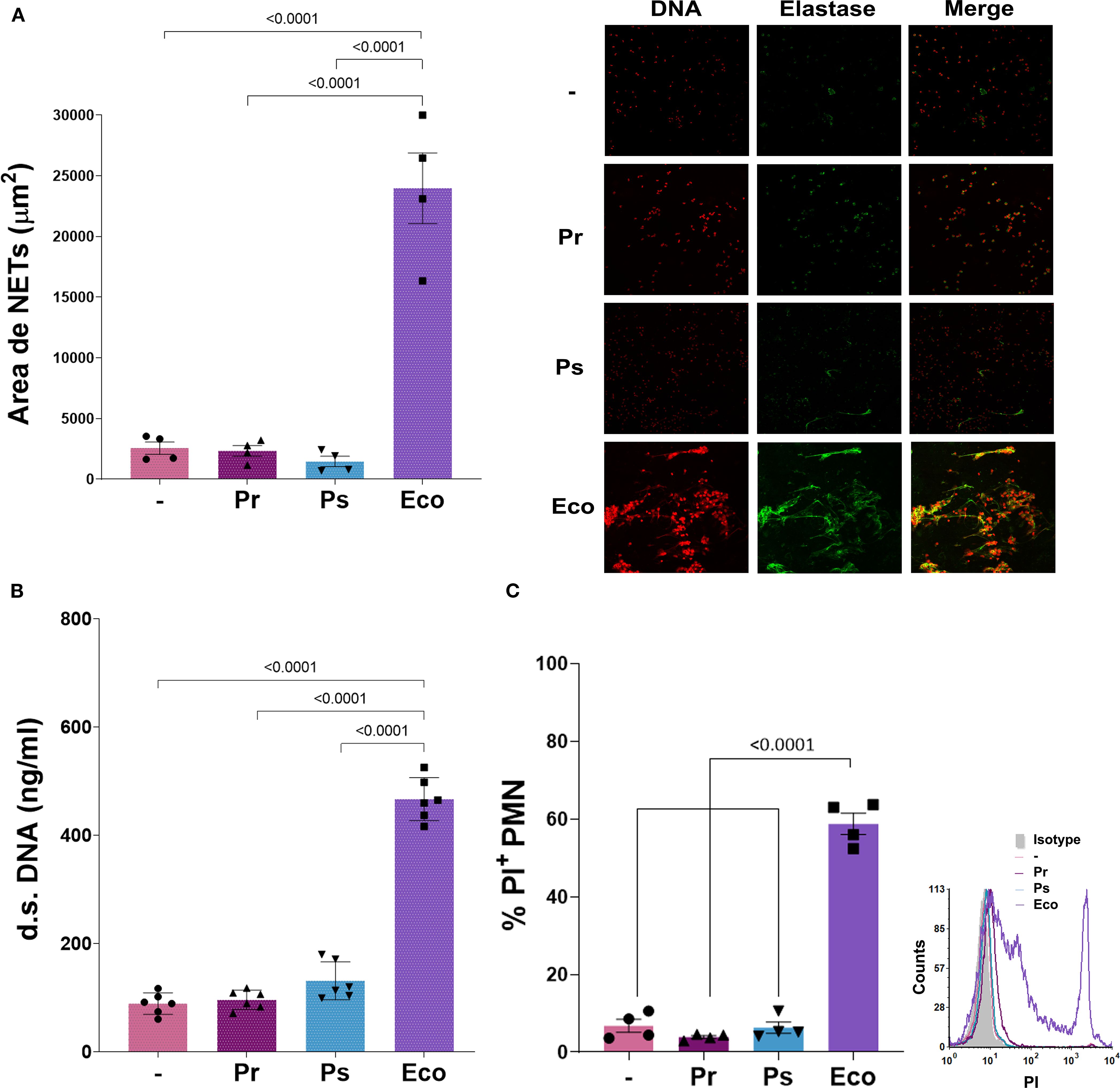 Figure 4. Suicidal Neutrophil extracellular traps (NETs) are not triggered by Pr or Ps in human PMN. Isolated PMN were incubated with Pr, Ps, or Eco in a bacteria:PMN ratio of 10:1 for 3 h The formation of NETs was determined by confocal microscopy and double-stranded (d.s.) DNA release. All results were expressed as the mean ± SEM; each point represents a different PMN donor. In all cases, data presented a normal distribution according to the Shapiro-Wilk normality test, and comparisons were performed using one-way ANOVA followed by the Tukey´s post-test for multiple comparisons. (A) NETs area (μm2) determined by confocal microscopy using propidium iodide (PI) and a specific antibody, for DNA and elastase staining, respectively. Double-positive DNA-elastase fibers were considered NETs for area quantification. Right panel: Representative microphotograph of NETs (200 x). (B) d.s. DNA release. (C) PMN viability determined by propidium iodide (PI) staining. The percentage of PI+ PMN was assessed by flow cytometry. Right panel: Representative histogram of PI fluorescence intensity for the different experimental groups.