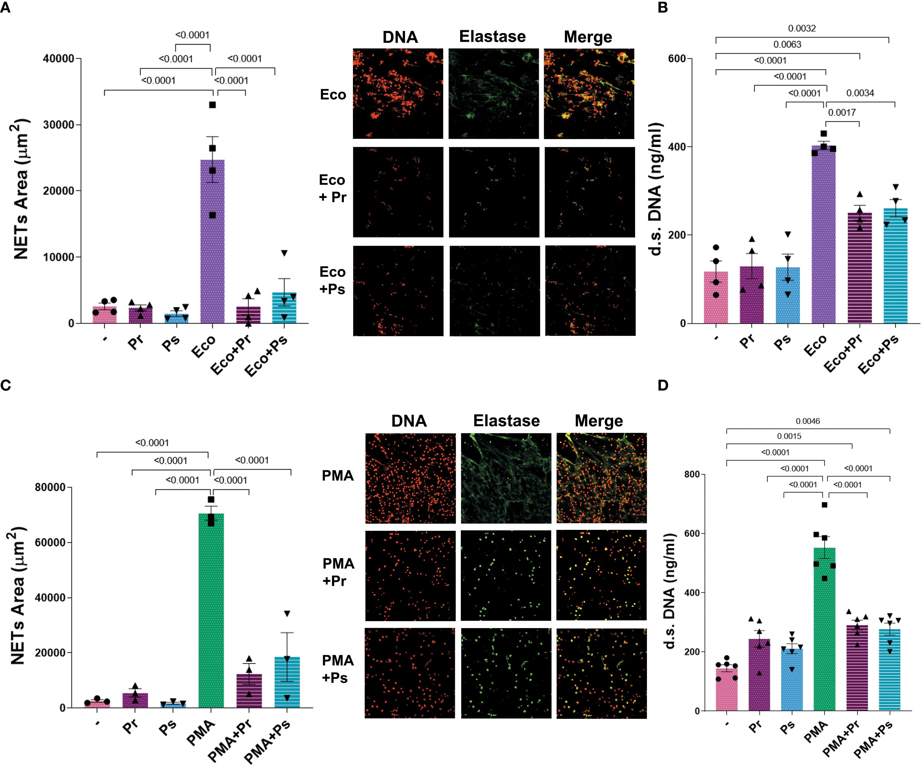 Figure 5. Pr and Ps affect suicidal NETs formation triggered by other stimuli. NETs were evaluated in PMN after being challenged with the different stimuli for 3 h. All results were expressed as the mean ± SEM; each point represents a different PMN donor. In all cases, data presented a normal distribution according to the Shapiro-Wilk normality test, and comparisons were performed using one-way ANOVA followed by the Tukey´s post-test for multiple comparisons. (A) NETs area (µm2) with representative microphotographs in the right (200 x), and (B) d.s. DNA release in the presence of Eco 1:1 ± Ps or Pr 10:1. (C) NETs area (µm2) with representative microphotographs in the right (200 x), and (D) d.s. DNA release in the presence of PMA (40 nM) ± Ps or Pr 10:1.