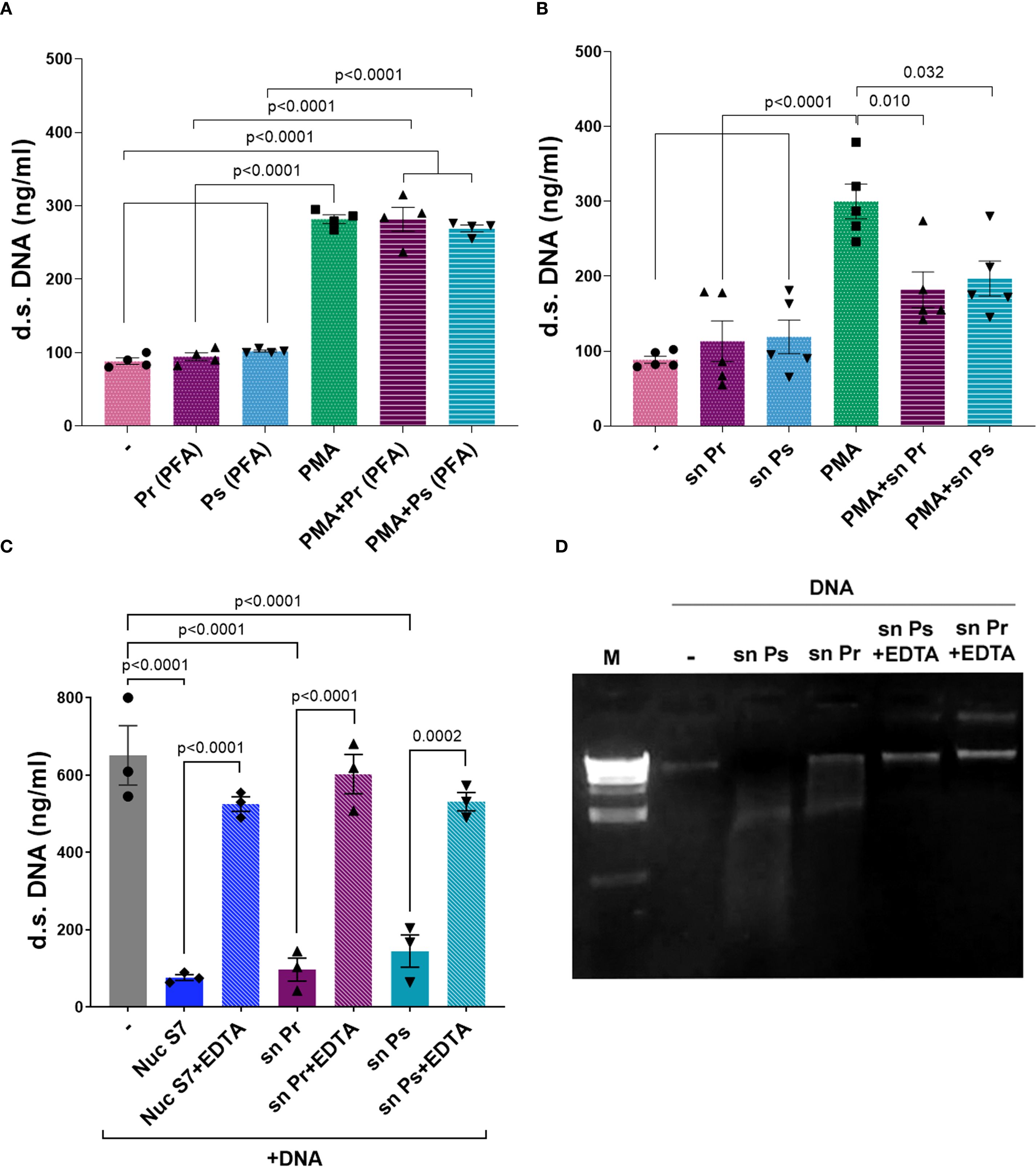 Figure 6. Pr and Ps viability is necessary for decreasing suicidal NETs triggered by PMA and depends on a DNase released by bacteria. Ps and Pr were fixed with PFA, or bacterial supernatant (sn) were collected, and were incubated with PMN ± PMA for 3 h. All results were expressed as the mean ± SEM; each point represents a different PMN donor. In all cases, data presented a normal distribution according to the Shapiro-Wilk normality test, and comparisons were performed using one-way ANOVA followed by the Tukey´s post-test for multiple comparisons. (A) d.s. DNA release in the presence of PMA (40 nM) ± Ps (PFA) or Pr (PFA) 10:1. (B) d.s. DNA release in the presence of PMA (40 nM) ± Ps (sn) or Pr (sn). (C) d.s. DNA quantification of sn obtained from Ps and Pr incubated for 1 h with eukaryotic DNA (600 ng/mL) ± EDTA (50 mM). (D) Visualization of eukaryotic DNA degradation by Pr or Ps sn and reversion by EDTA in a 2% agarose gel stained with ethidium bromide.