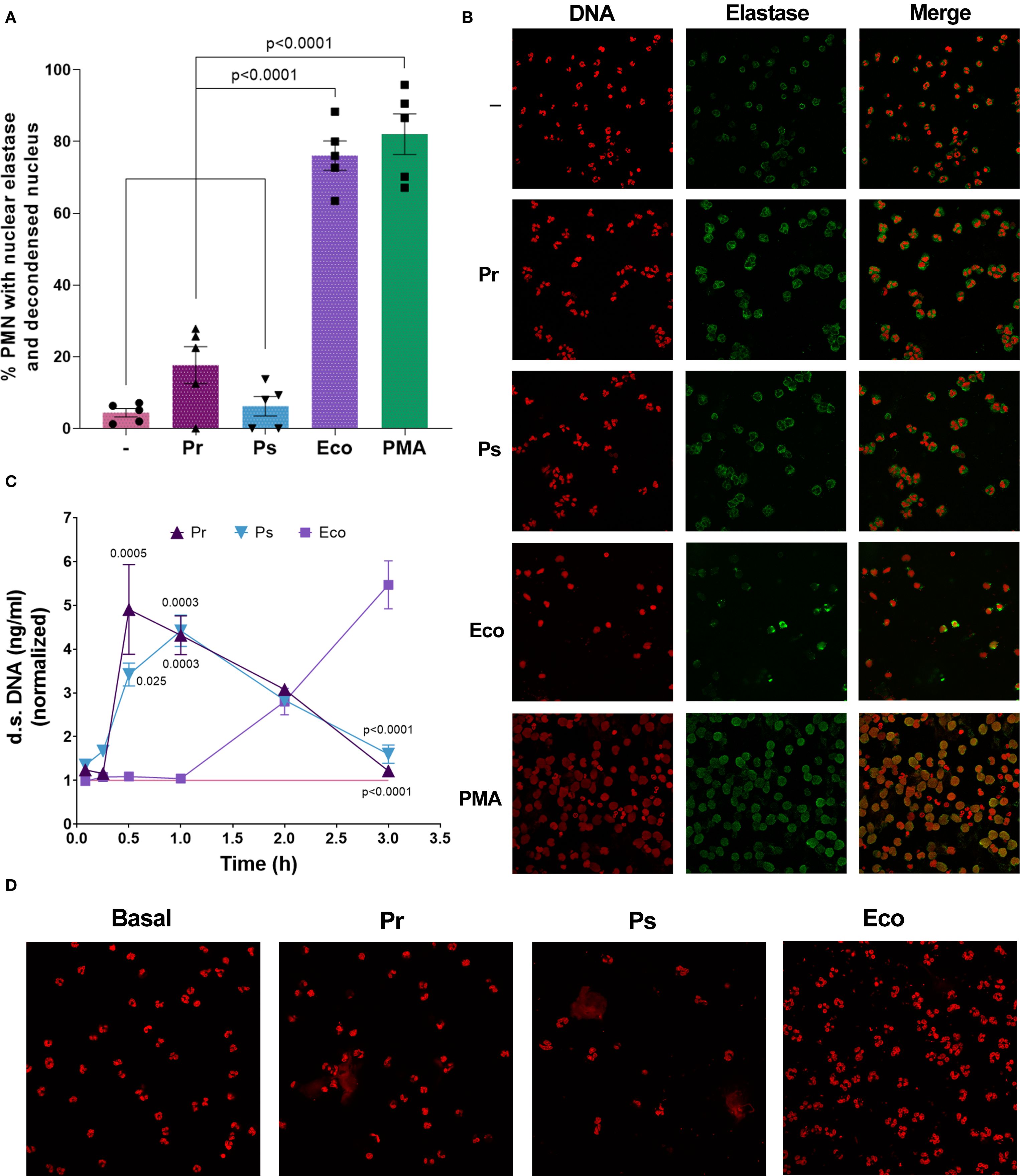 Figure 7. No nuclear elastase with DNA decondensation was observed in PMN challenged with Pr and Ps but vital NETs were induced by bacteria. (A) Percentage of PMN with nuclear DNA decondensation co-localizing with elastase quantified by confocal microscopy after incubation with Pr, Ps, Eco, or PMA for 90 min in a bacteria:PMN ratio of 10:1. All results were expressed as the mean ± SEM; each point represents a different PMN donor. Data presented a normal distribution according to the Shapiro-Wilk normality test, and comparisons were performed using one-way ANOVA followed by Tukey´s post-test for multiple comparisons. (B) Representative microphotographs (600 x) from (A) showing individual DNA and elastase staining and the resulting superposition (merge). (C) Extracellular d.s. DNA release from PMN challenged with Pr, Ps, or Eco in a bacteria:PMN ratio of 10:1 measured at different time points. The values were normalized to those obtained for untreated PMN (–) (pink line). Results were expressed as the mean ± SEM (n=4–8 for each time point). Data for each time point presented a normal distribution according to the Shapiro-Wilk normality test and was analyzed using one-way ANOVA followed by Tukey´s post-test for multiple comparisons. The p values refer to comparisons vs. Eco. (D) Representative microphotographs (600 x) of confocal microscopy experiments of PMN challenged for 30 min with Pr, Ps, or Eco, showing DNA stained with PI.
