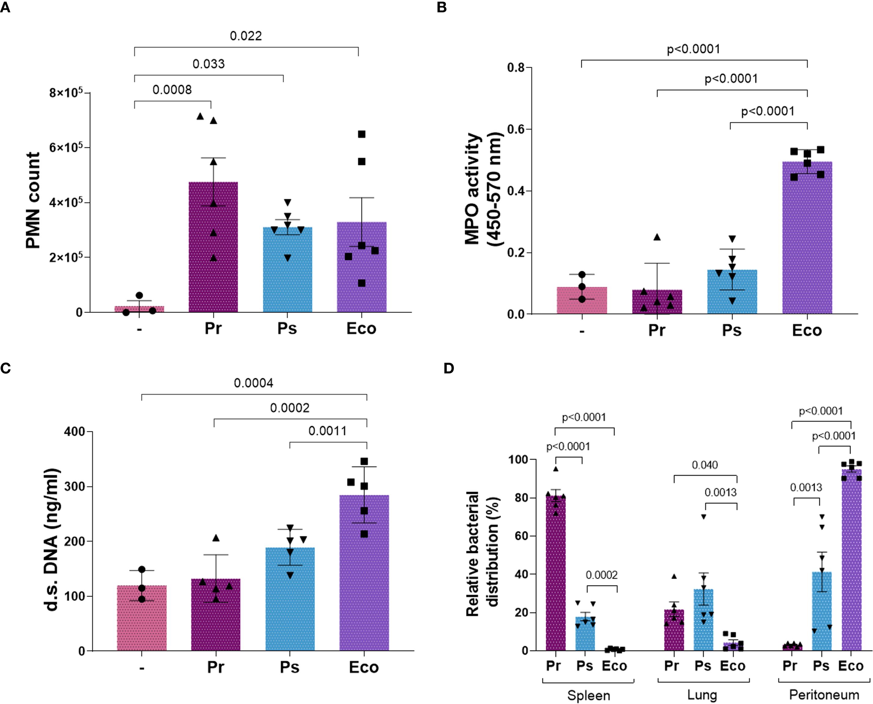 Figure 8. The lack of in vivo NETs formation after Pr and Ps infection increased bacterial dissemination to organs. Mice were inoculated i.p. with 1x106 CFU of Pr, Ps, or Eco. After 24 h, the spleen, lungs, and the peritoneal liquid (pl) were collected. All results were expressed as the mean ± SEM; each point represents a different mouse. Data was analyzed using one-way ANOVA followed by Tukey´s post-test for multiple comparisons. (A) Number of PMN that migrated to the infectious focus (pl) in the presence of each bacterium. (B) MPO activity in the pl. (C) d.s. DNA in the pl. (D) Relative bacterial distribution (%) calculated as described in Materials and Methods by CFU determination in the pl, spleen, and lungs. Data was analyzed for each organ using one-way ANOVA followed by Tukey´s post-test for multiple comparisons.