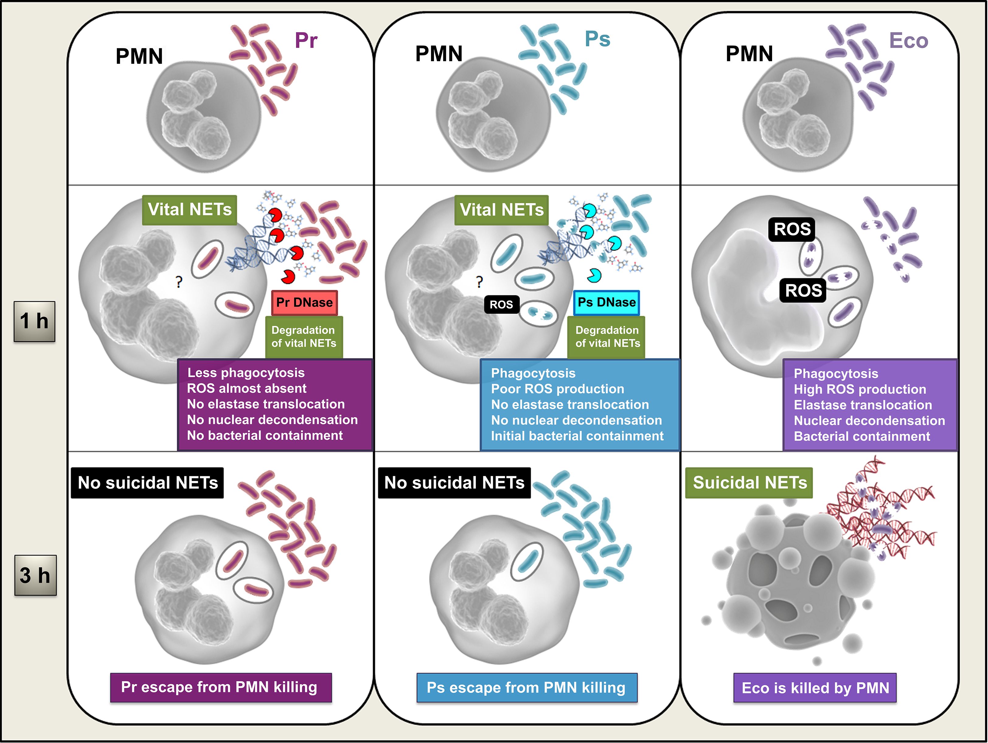 Figure 9. Schematic model summarizing the in vitro results obtained from this study. PMN become activated by Eco, phagocytosing the bacterium and inducing the production of ROS, a signal necessary for the early migration of elastase to the nucleus, DNA decondensation, and subsequent release of suicidal NETs, observed at 3 h. Full PMN activation results in the efficient elimination of Eco, involving both intracellular and extracellular bactericidal mechanisms of the PMN. Ps is also phagocytosed, but the generation of ROS induced in response to this phagocytosis is low. Whether the amount of ROS produced is insufficient, or because active evasion mechanisms mediated by the bacteria are taking place, neither elastase migration to the nucleus nor DNA decondensation is observed. However, the bacteria induce the production of vital NETs, which, combined with some Ps-induced PMN activation, generate an early partial containment of the bacteria. However, the release of a Ps-derived DNase degrades these vital NETs, which, together with the absence of suicide NETs induction, by an unknown mechanism (?), allow the bacteria to finally escape PMN-mediated death. Pr is also phagocytosed but the amount of internalization is lower, and ROS production is almost absent. Due to this low amount of ROS and/or due to some unexplored evasion mechanism mediated by the bacteria, no elastase migration to the nucleus or DNA decondensation is observed, and, consequently, no suicidal NETs are released. The mechanism by which Pr interferes with suicidal NETs formation is unknown (?). Similar to what was observed with Ps, Pr induces the formation of vital NETs and secretes DNases that degrade them. Pr induces less PMN activation in general and evades neutrophil bactericidal responses from an early stage, never being contained.