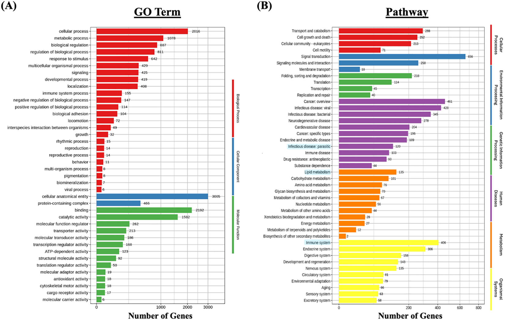 Functional enrichment analysis of differentially expressed genes (DEGs) in L. crocea skin following Metanophrys sp. infection. (A) Gene Ontology (GO) classification of DEGs based on biological process (red), cellular component (blue), and molecular function (green). Bars represent the number of DEGs annotated within each GO term. (B) KEGG pathway enrichment analysis. DEGs were grouped under major KEGG categories, including metabolism (orange), environmental information processing (green), genetic information processing (purple), cellular processes (blue), and organismal systems (yellow). Bars indicate the number of DEGs associated with each pathway.