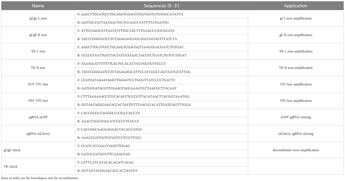 Currently, trivalent vaccines for feline use in clinical settings are primarily based on inactivated vaccines and modified live attenuated vaccines. Among these, inactivated trivalent vaccines are the most widely administered. However, their protective efficacy is limited, with short-lived immune responses, rendering them insufficient in preventing infection by highly virulent strains responsible for feline upper respiratory tract diseases. Feline herpesvirus type 1 (FHV-1) has shown promising potential as a viral vector platform for vaccine development targeting feline pathogens, offering considerable significance for feline health and disease prevention (30).In recent years, the CRISPR/Cas9 system has been extensively utilized in viral genome editing and vaccine design, enabling precise genetic modifications that enhance vaccine safety and efficacy (31, 32). Within α-herpesviruses, gI, gE, and thymidine kinase (TK) are among the most commonly studied virulence-associated genes. Although these genes are not essential for viral replication, their deletion attenuates virulence, making such gene-deleted viral mutants attractive candidates for developing safe and effective vaccine vectors.