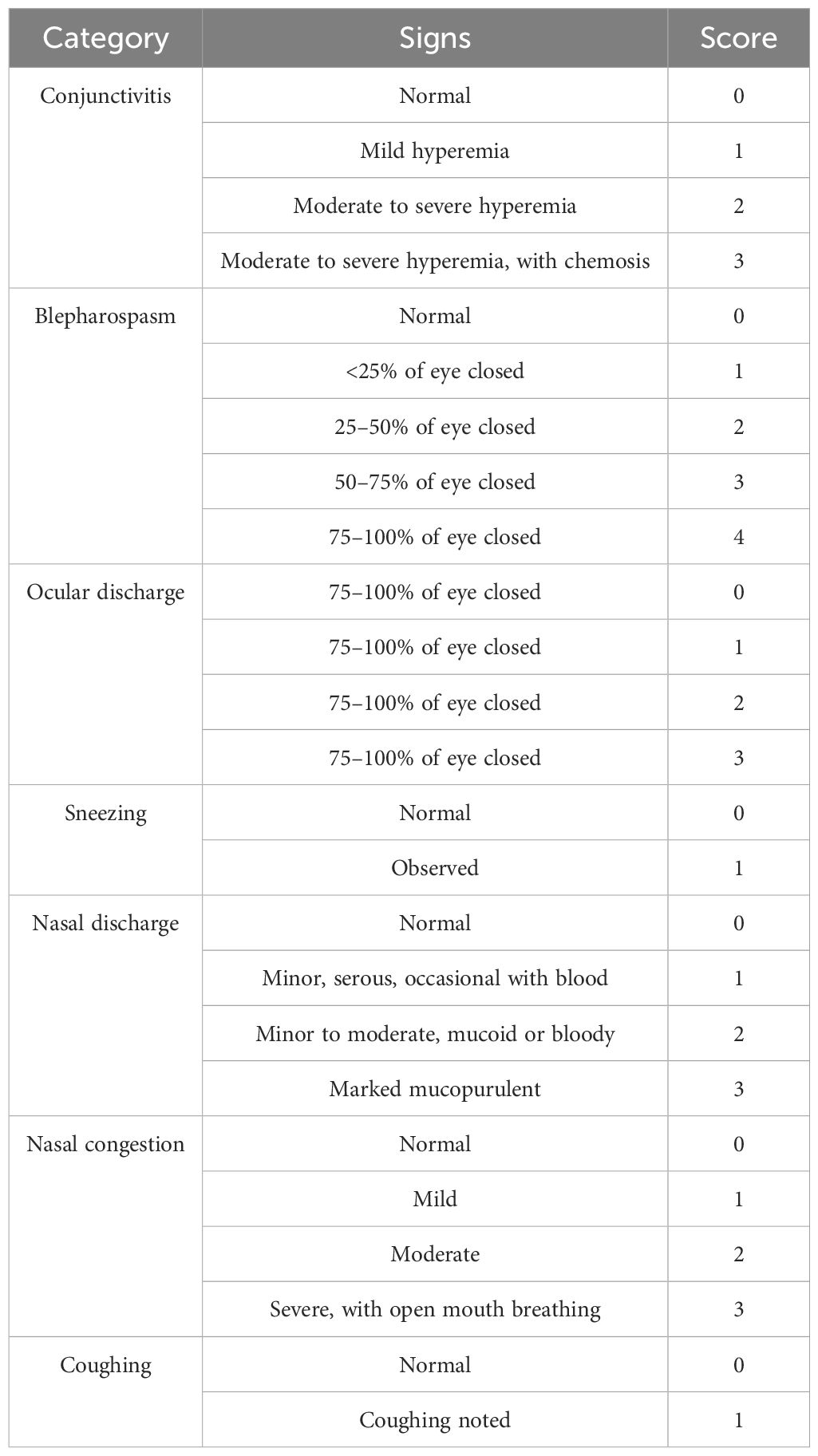 Eight healthy, three-month-old domestic cats, pre-screened and confirmed negative for FHV-1, FPV, and FCV, were randomly assigned to two groups (n = 4 per group). The experimental group received 1 mL of the recombinant FHV ΔgI/gE/TK FCV VP1-FPV VP2 vaccine (106 TCID50/mL) via intranasal (IN) immunization, while the control group received 1 mL of cell culture medium via the same route. At 21 days post-immunization (dpi), The experimental group were boosted using the same dose of recombinant virus (106 TCID50/mL) via both IN and subcutaneous (SC) routes. On day 42 dpi, both groups were challenged intranasally with FHV WX19 at a dose of 105 TCID50/mLL. Clinical signs were monitored daily for 56 days following the primary immunization. Symptom severity was assessed using a previously described scoring system for FHV-1-associated diseases (28), as detailed in Table 2. Nasal secretions were collected every three days using sterile polyester swabs. Blood samples were collected weekly, and serum was separated and stored at –20°C for subsequent antibody analysis. All cats were observed throughout the 8-week study period for health status, clinical signs, and immunological response to vaccination and challenge.