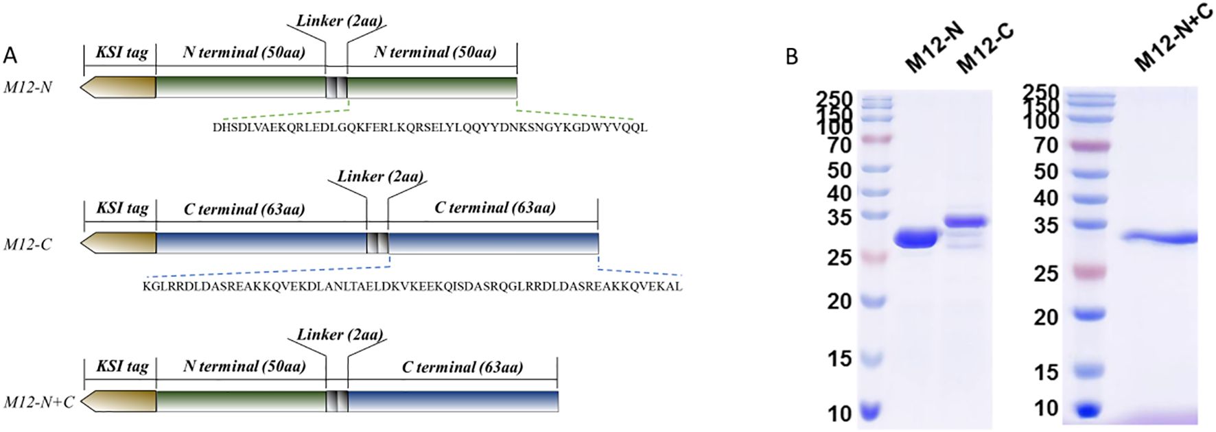 The full-length sequence of M12 protein (GenBank: ABF32911.1, 575 aa) was analyzed. The adjusted KSI sequence from Comamonas testosteroni (MGSSHHHHHHSSGLVPRGSHMHTPEHITAVVQRFVAALNAGDLDGIVALFADDATVEDPVGSEPRSGTAAIREFYANSLKLPLAVELTQEVRAVANEAAFAFTVSFEYQGRKTVVAPIDHFRFNGAGKVVSIRALFGEKNIHACQGS) and the sequences of M12-N (amino acids 42 to 91), M12-C (amino acids 376 to 438) and M12-N+C were synthesized together and cloned into the pET-28b (+) vectors (between NdeI and EcoRI) to produce the recombinant plasmids respectively. Subsequently, the recombinant plasmids were transformed into E.coli T7 Express in order to induce the expression of proteins upon induction with 1 mM IPTG at 37 °C, with shaking 200rpm for 4 hours. The bacterial precipitates were obtained through centrifugation, subsequently treated with sonication, and filtered. The recombinant proteins in supernatant were then purified using Ni resin affinity chromatography (HISTRAP HP, Cytiva). Protein was detected using a 12% SDS-PAGE and the concentration was determined with a BCA protein assay kit.