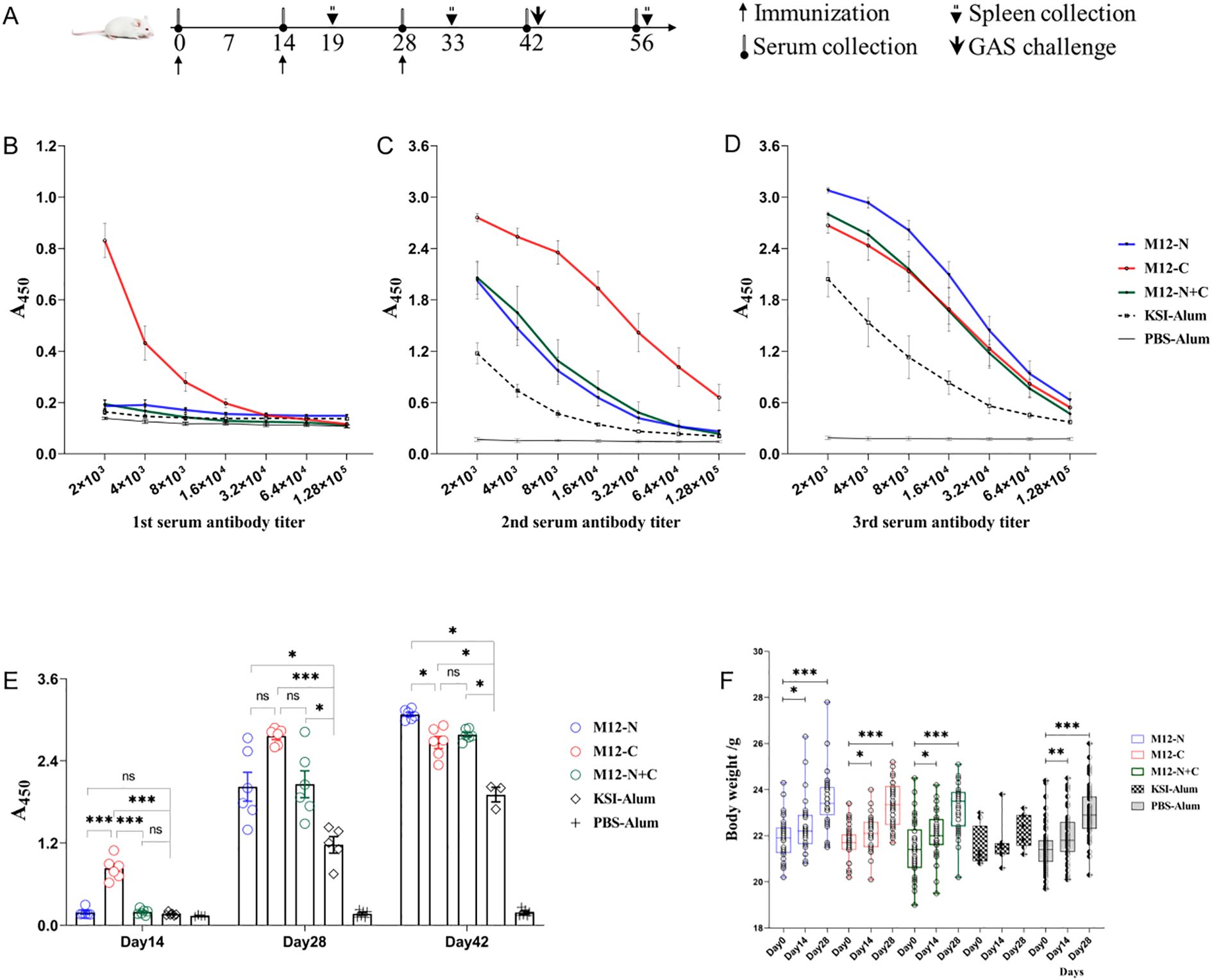 Figure 2. The serum antibody levels and body weights of immunized mice. (A) Schematic diagram illustrating the immunization process, sample collection, and challenge schedule. (B-D) Serum antibody levels determined by ELISA two weeks after each immunization. Data are represented as the mean ± SEM, n=6 for each group. (E) Statistical graph depicting the serum antibody levels. Data are represented as the mean ± SEM, n=6 for each group. (F) Changes in body weight throughout the vaccination process. Data are represented as the mean ± SD, M12-N (n=37), M12-C (n=37), M12-N+C (n=37), KSI-Alum (n=8), PBS-Alum (n=58). *P < 0.05, **P < 0.01, ***P < 0.001.