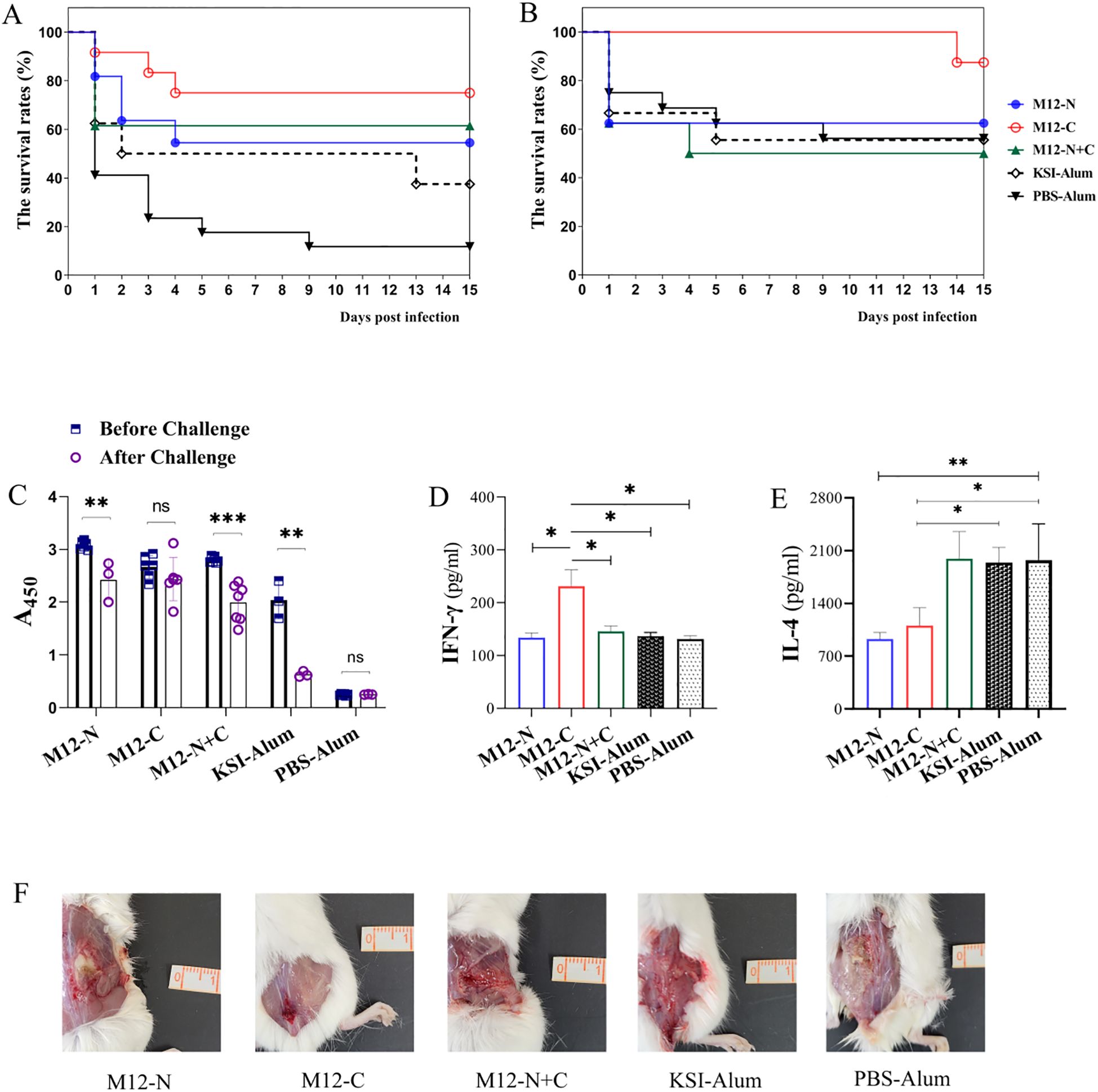 Moreover, mice immunized with M12-C maintained a higher level of antibodies compared to those immunized with M12-N or M12-N+C after the challenge (Figure 3C). The antibody level in M12-C immunized mice did not decrease significantly and was able to sustain a high level after the MGAS9429 challenge. In contrast, the antibody levels in KSI-Alum immunized mice decreased notably, correlating with a relatively low survival rate among the mice. Fifteen days after challenge with MGAS9429, the splenic homogenate of mice immunized with M12-C exhibited a higher level of IFN-γ and a lower level of IL-4 compared to control mice (Figures 3D, E). The surviving M12-C immunized mice showed a robust Th1-type immunity following the MGAS9429 challenge. In addition, it can be seen from the skin lesion photos of mice that the inflammatory reaction of mice immunized with M12-C was mildest, while mice immunized with PBS-Alum was severest (Figure 3F). The abscess was deeper and larger in the control mice. These findings indicate that immunization with M12-C may offer prolonged protection post infection.