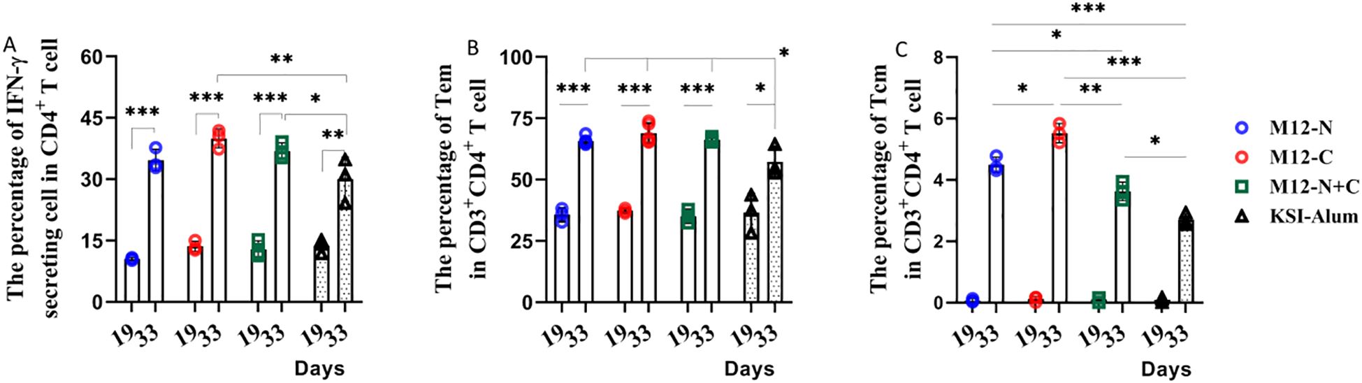 Figure 4. Immunization elicited a higher frequency of CD4+ IFN-γ producing T cells and CD4+ Tem cells predominate following the third immunization. (A) The percentage of IFN-γ secreting cells, (B) Tem and (C) Tcm in CD3+CD4+ T cells was determined. Data are represented as the mean ± SD, n=3 for each group, showing an increase with statistical significance indicated by *P < 0.05, **P < 0.01, ***P < 0.001.