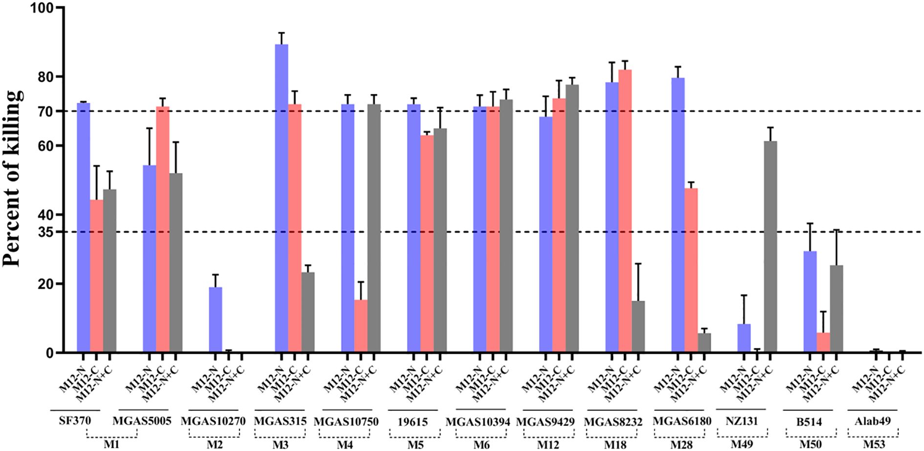 Figure 5. The opsonophagocytic killing assay of HL-60 cells using antisera against GAS. The OPK assay using GAS with antiserum (M12-N, M12-C, M12-N+C), specifically targeting the M peptides. The X-axis represented the groups in which the 3-fold diluted antiserum mediated the effects of multiple GAS serotypes, while the Y-axis denoted the percentage of killing. The two dashed lines corresponded to killing percentages of 35% and 70%, respectively. Each bar represented the mean value of three replicate measurements.