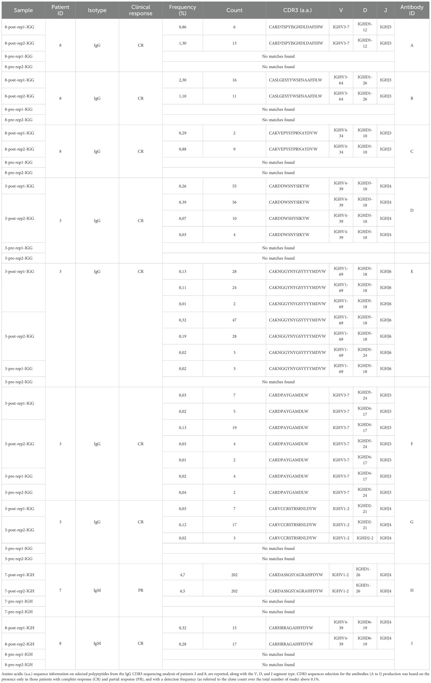 Hence, to identify any possible antibodies that were significantly enriched after immune treatment, including potential de novo formed clonotypes, in responder patients, we applied the following criteria for CDR3 sequences selection: being detected only in patients in complete response; being present in both post-therapy replicates; being present in one pre-therapy replicate at most; detection frequency (clone fraction) above 0.1% (Table 2). With these principles, we single out seven possible CDR3 sequences for candidate de novo anti-melanoma antibodies (A-G), from patient 8 and patient 3 (Figures 2A, B). With only three exceptions (sequence C, E, and F), these selected amino acid sequences were derived from mRNA transcripts that were mostly found at a clone count above two (meaning that a distinct CDR3-codifying mRNA sequence has been detected more than twice), in the upper 20% quantile (Q1), with fewer candidate sequences being detected at a lower frequency (Q2-5) as well (Figures 2C, D). Interestingly, for patient n.8, the clone abundance distribution exhibited a substantial variation before and after treatment, showing an increase in the total amount of singletons and doubletons (clones that were found at either one or two copies) and a reduction in the number of unique clones detected at higher frequency (Q1), following the immune treatment (Figure 2C). By speculation, a decrease in the proportion of CDR3 sequences detected in the top-20% clone count (Q1) might suggest that only a small group of B cell clones is becoming more dominant post-treatment, reflecting an enrichment of few specific sequences. Coherently, a decrease in the clonotype diversity, and an increase of the mean clonotype frequency (Supplementary Table 1; Supplementary Figure 4) are observed in samples post-therapy. Also, different mRNA sequences encoding for the same antibody were detected at more than one clone count (antibodies D, E, F, and G), suggesting convergence and selection towards the same amino acid sequence from different clonotypes. Detailed information on selected polypeptides from IgG CDR3 sequencing data from patients 3 and 8, including the V, D, and J type of segment used, are reported in Table 2.