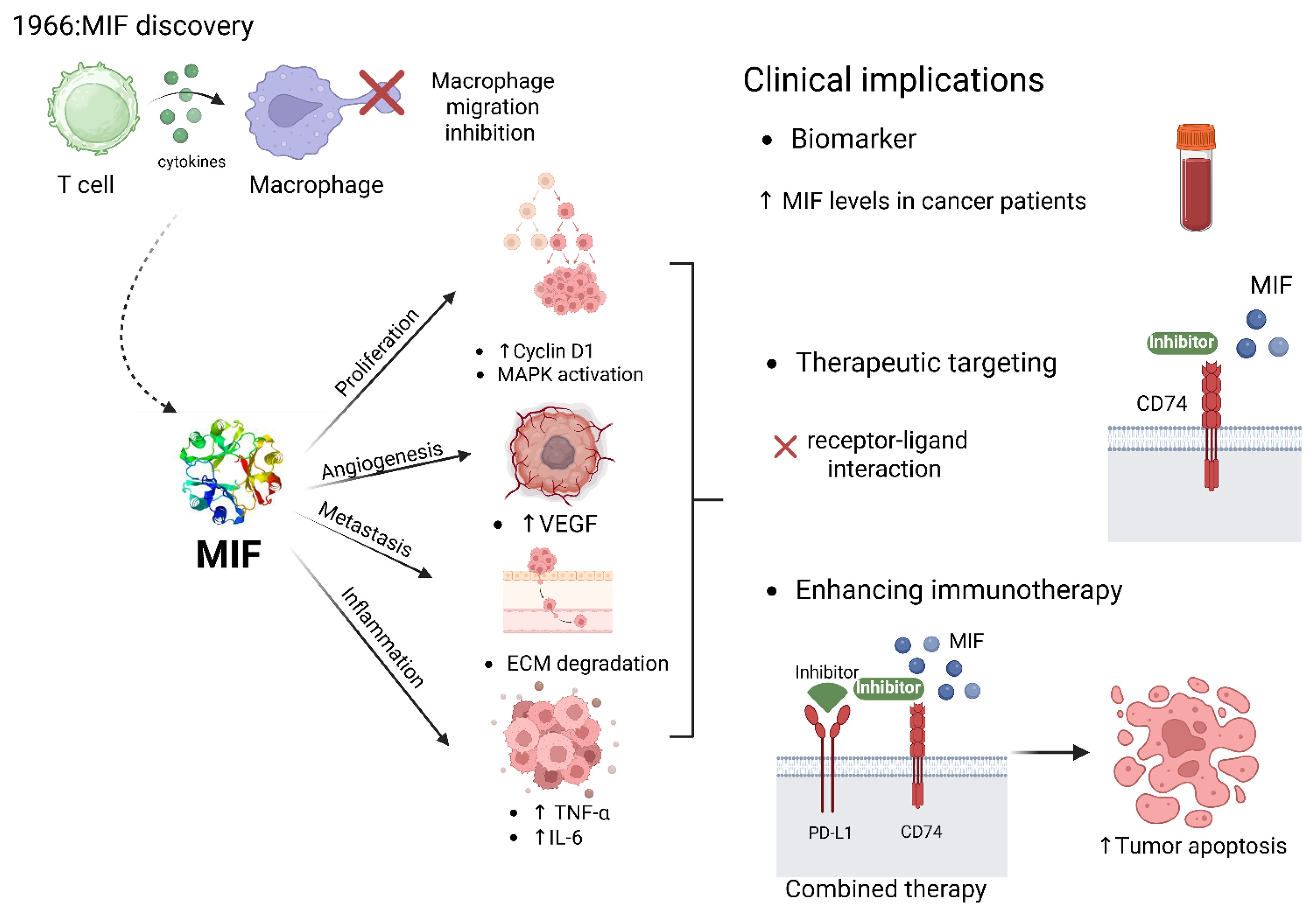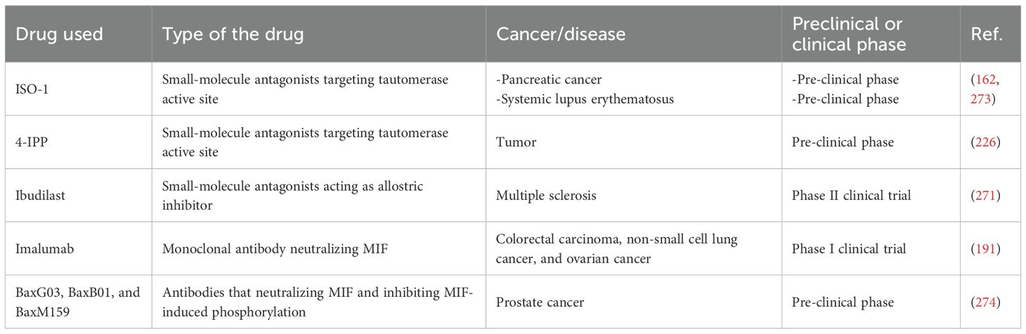 Therapeutically, targeting MIF has shown promise in cancer treatment. MIF antagonists, such as ISO-1 and 4-IPP, have been explored as potential therapeutic agents for cancer. They can bind to MIF’s catalytic active site and reduce its activity, leading to decreased tumor growth and extended survival in animal models. However, the cytotoxic effects of these antagonists vary, with ISO-1 showing higher toxicity compared to 4-IPP (206). Moreover a study confirmed that tumor associated MIF suppresses T-cell activation through suppressing three mechanisms of T-cell activation: cytokine, solid-phase anti-CD3,and allogeneic MHC (91). MIF can be targeted by knocking out or inhibitory molecules to restore T cell activation; thus, it can be used as an immunotherapeutic target.