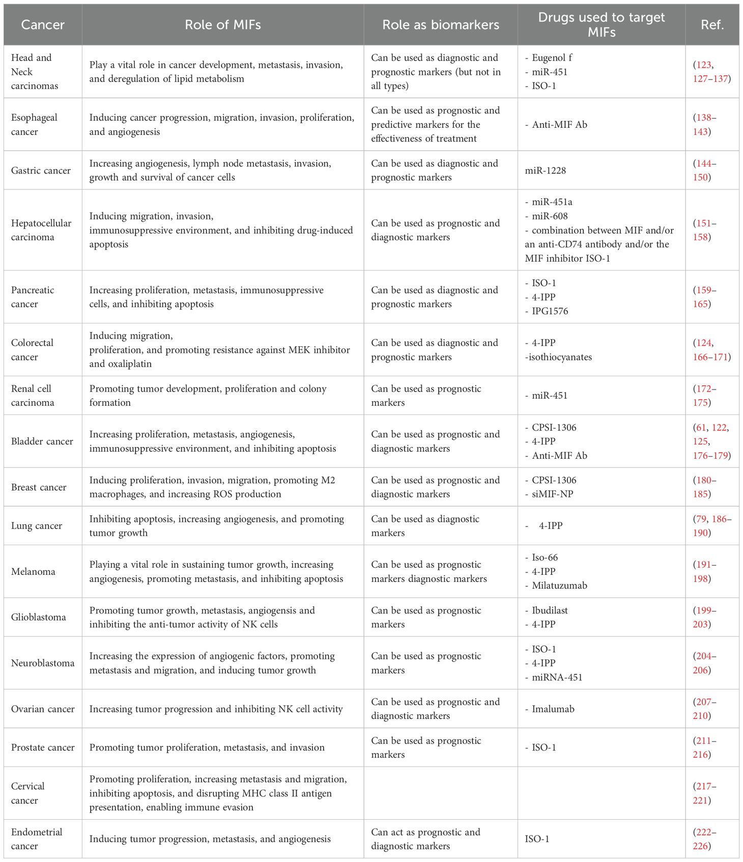 Breast cancer (BC) is among the most frequently diagnosed cancers in women (227, 228). MIF plays a crucial role in breast cancer progression and has been the subject of multiple investigations (229, 230). Studies have demonstrated that MIF is significantly overexpressed in non-invasive BC cell lines, such as MDA-MB-468 and ZR75-1, when compared to benign cell lines like MCF-12A. However, MIF expression is notably lower in highly invasive BC cells (MDA-MB-231) even though the MIF receptor CD74 is highly expressed. This suggests that MIF likely targets invasive BC cells through its interaction with CD74. Blocking CD74 has been shown to inhibit MDA-MB-231 cell proliferation, highlighting the role of MIF/CD74 signaling in driving the growth of both non-invasive and invasive cancer cells. Moreover, MDA-MB-468 cells had a 2.1 times higher proliferation rate than MCF-12A cells, yet MDA-MB-231 cells had the highest baseline proliferation rate (approximately 7.8 times higher than that of benign cells). When treated with recombinant MIF (rMIF) at doses in the range of 0–150 ng/ml, MCF-12A and both tumor cell lines demonstrated increased proliferation, with the strongest effect observed in cells with the highest CD74 expression which are MDA-MB-231. MIF not only supports cell growth but also promotes the migration and invasion of cancer cells in a dose-dependent manner. In MDA-MB-231 cells, MIF acts in a chemokine-like manner to facilitate movement through basement membrane-like layers, suggesting that MIF produced in the TME contributes to cancer invasiveness (231). Interestingly, in mouse models, when comparing 67NR non-metastatic cells to both a non-tumorigenic control and the metastatic 4T1 cells, researchers observed higher basal levels of MIF secretion in the 67NR cells. However, this basal MIF secretion was not linked to the invasive phenotype in the studied mouse breast cancer cell lines. Despite the differences in MIF secretion levels, no clear relationship was established between MIF secretion and invasiveness in these models (180). Inhibition of autophagy in 66cl4 triple negative breast cancer cell line led to increased intracellular ROS levels, which further upregulated MIF expression, potentially through ROS-dependent transcription factors. This mechanism underscores MIF’s involvement in macrophage polarization, particularly in promoting the M2 subtype. Research involving MIF-deficient mouse macrophages revealed reduced M1 polarization, suggesting that MIF is essential for macrophage function and amplifies both extracellular and intracellular signaling (181). Additionally, MIF has been identified as a novel 3’ flap nuclease that helps remove unpaired 3’ flaps in DNA during replication. It cooperates with nuclease-deficient polymerases, such as Pol α, to ensure proper DNA elongation and fidelity. In cancer cells, the absence of MIF’s nuclease activity results in increased mutations, slower DNA replication, and cell cycle delays, highlighting its role in helping cancer cells survive DNA replication stress. Moreover, MIF’s recruitment to DNA replication sites by PARP1(Poly(ADP-ribose) polymerase 1) during the S phase further emphasizes its involvement in maintaining cancer cell proliferation (182).