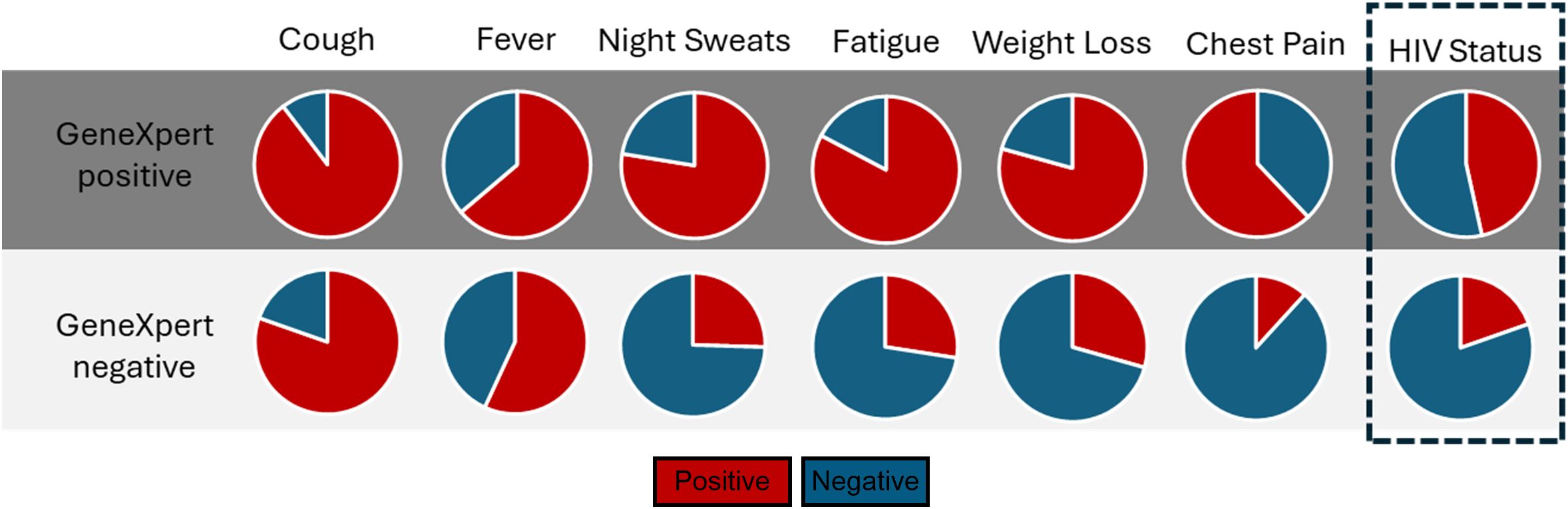 Initially, we tested sputum samples obtained from the AHRI RePORT SA TB cohort. All participants were tested by GeneXpert and are grouped as GeneXpert positive vs. negative. All participants displayed at least one classical TB symptom, either persistent cough, fever, unintended weight loss, night sweats, fatigue and chest pain, at the time of testing (summarized in Figure 1). Of the GeneXpert-negative participants, 19.6% were HIV-positive compared to the 46.6% HIV-positive GeneXpert positive participants, consistent with the increased risk of TB disease associated with HIV infection. These data were consistent with the high prevalence of HIV in KZN, which was reported at 19.6% in 2024 by the Department of Health (20) and the high HIV/TB coinfection rate of 59% reported in the 2024 South African National TB Survey.
