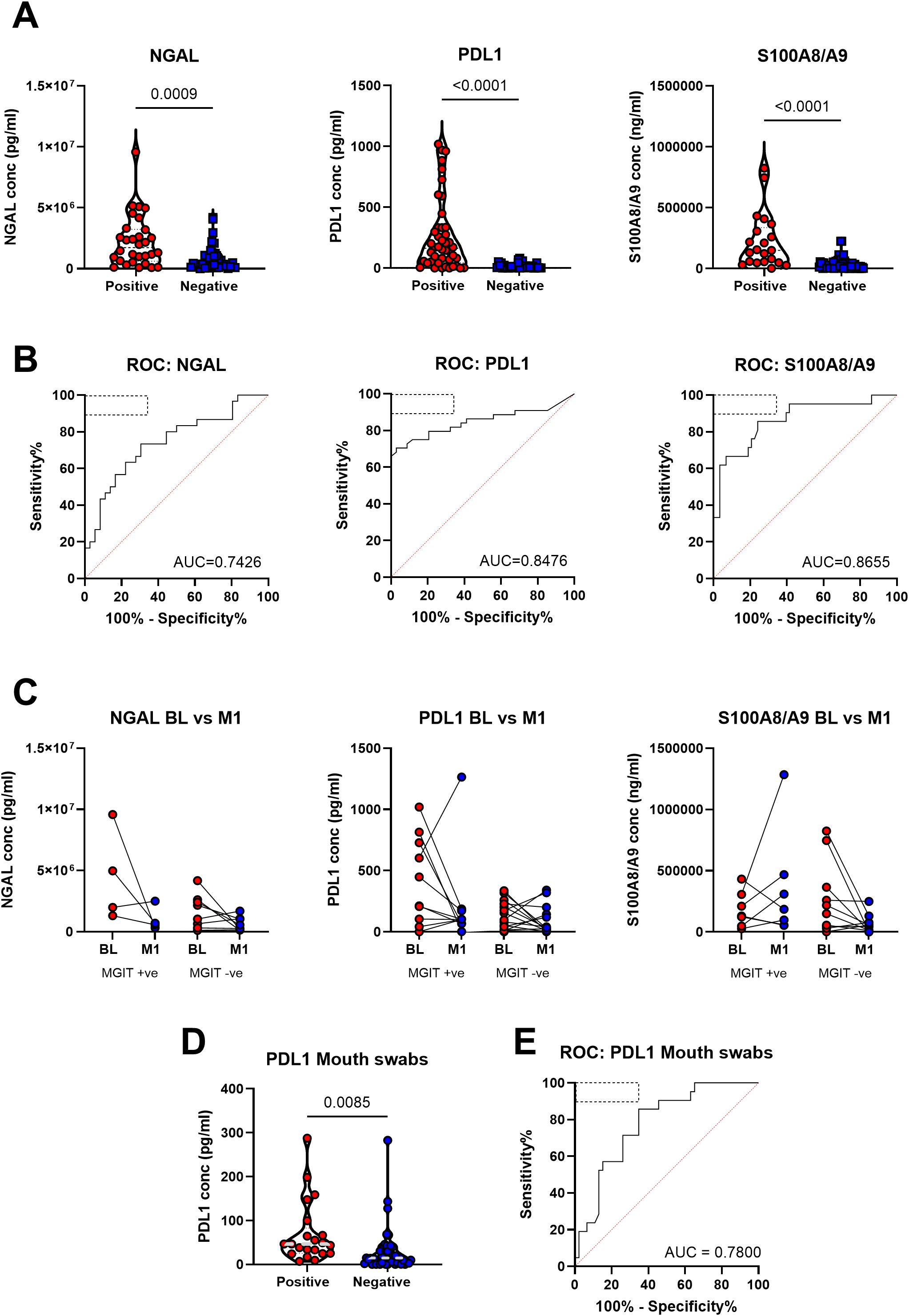 Figure 2. Neutrophil-related proteins in patient sputum were significantly associated with tuberculosis disease state in the AHRI RePORT SA TB cohort. (A) The levels of the neutrophil associated proteins neutrophil gelatinase-associated lipocalin (NGAL), programmed death-ligand 1 and the S100A8/A9 heterodimer are shown as a product of GeneXpert result. (B) The receiver operator curves for each protein are demonstrated with the WHO target product profile indicated by the dashed box with area under curves being reported. (C) Protein levels at baseline and month 1 after treatment were recorded and reported based off clearance of the TB at the month 1 timepoint, with all patients being GeneXpert and MGIT positive at baseline. (D) Baseline sputum and mouth swab PDL-1 levels comparing TB positive and TB negative. (E) The receiver operator curve for the mouth swab results is demonstrated with the WHO target product profile indicated by the dashed box with the area under the curve reported. A total of 79 sputum samples were collected, with confidence intervals of 95% being indicated for area under curve values.