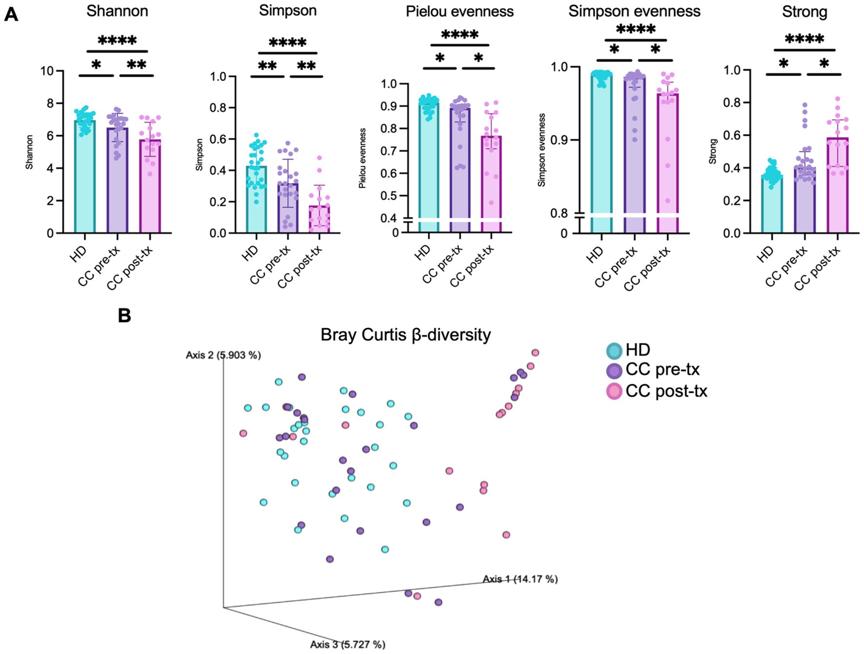 Figure 1. Gut microbiota diversity in fecal samples from healthy donors (HD), CC patients before treatment (CC pre-tx), and CC patients after treatment (CC post-tx). (A) α-diversity metrics: Shannon, Simpson, Pielou evenness, Simpson evenness and Strong. Comparisons between groups were performed using one-way ANOVA for parametric data (Shannon and Simpson), and the Kruskal-Wallis test for non-parametric data (Pielou evenness, Simpson evenness, and Strong), followed by the Benjamini-Hochberg FDR method for multiple comparison correction. Data are shown as mean ± SD for parametric variables and median with IQR for non-parametric variables. (B) β-diversity: Three-dimensional scatter plot obtained by PCoA using the Bray-Curtis distance, showing the distance between study groups in terms of β-diversity. Statistical analyses were performed using PERMANOVA to determine the statistical significance of the observed separations in the coordinate space. *p ≤ 0.05, **p≤ 0.01, ****p ≤0.0001. FDR, False Discovery Rate; PCoA, Principal Coordinates Analysis; PERMANOVA, Permutational Multivariate Analysis of Variance.