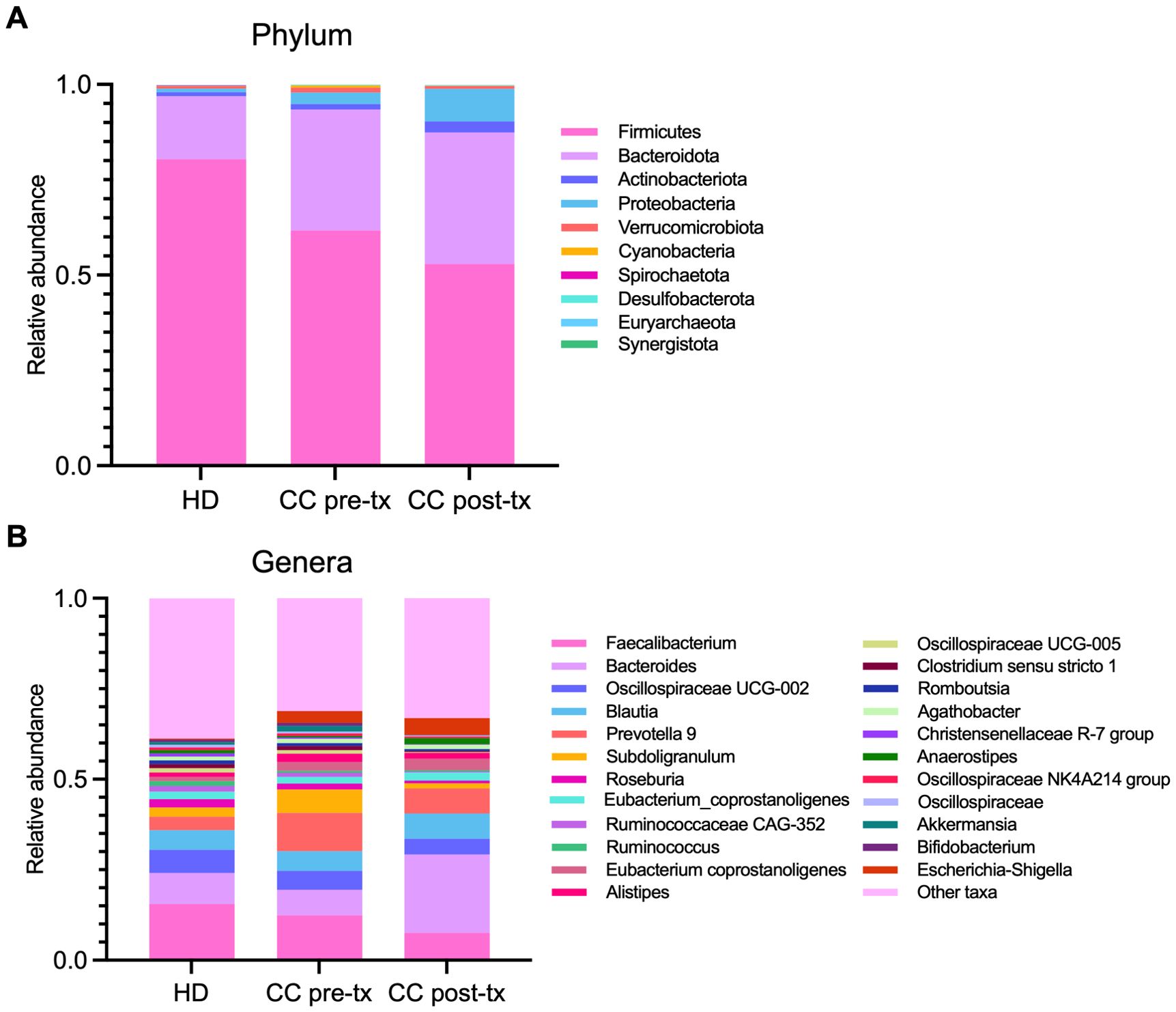 Figure 2. Relative abundance of gut microbiota in fecal samples from healthy donors (HD), CC patients before treatment (CC pre-tx), and CC patients after treatment (CC post-tx). (A) Phylum-level and (B) genus-level relative abundances are represented as stacked bar plots of ASVs detected in the study groups. ASVs, Amplicon Sequence Variants.