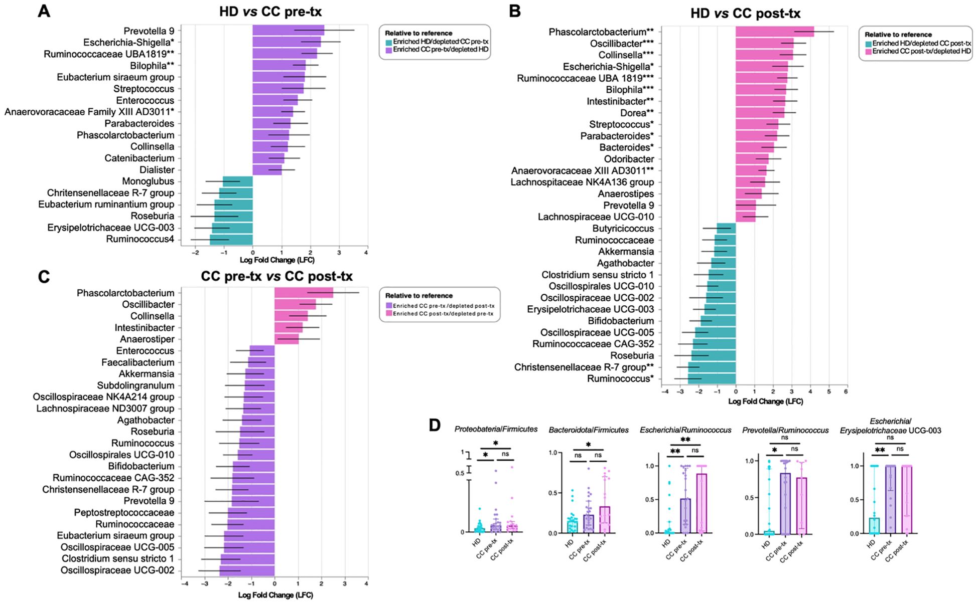 Figure 3. Differential taxon analysis of gut microbiota in fecal samples from healthy donors (HD), CC patients before treatment (CC pre-tx), and CC patients after treatment (CC post-tx). (A) Comparison of HD vs. CC pre-tx, (B) Comparison of HD vs. CC post-tx, and (C) Comparison of CC pre-tx vs. CC post-tx at the family and genus levels using ANCOM-BC. Blue bars represent bacterial taxa enriched in HD, purple bars in CC pre-tx, and pink bars in CC post-tx. Bars indicate the LFC obtained by ANCOM-BC between study groups, using an LFC cutoff of ±1.5. ANCOM-BC. (D) Ratios of CLR-transformed relative abundance of selected taxa between groups. Comparisons between groups were performed using the Kruskal-Wallis test for non-parametric data, followed by the Benjamini-Hochberg FDR method for multiple comparison correction. Data are shown as median with IQR. *p ≤ 0.05, **p ≤ 0.01, ***p ≤ 0.001. LFC, Log Fold Change; ANCOM-BC, Analysis of Compositions of Microbiomes with Bias Correction; CLR, Centered Log-Ratio.
