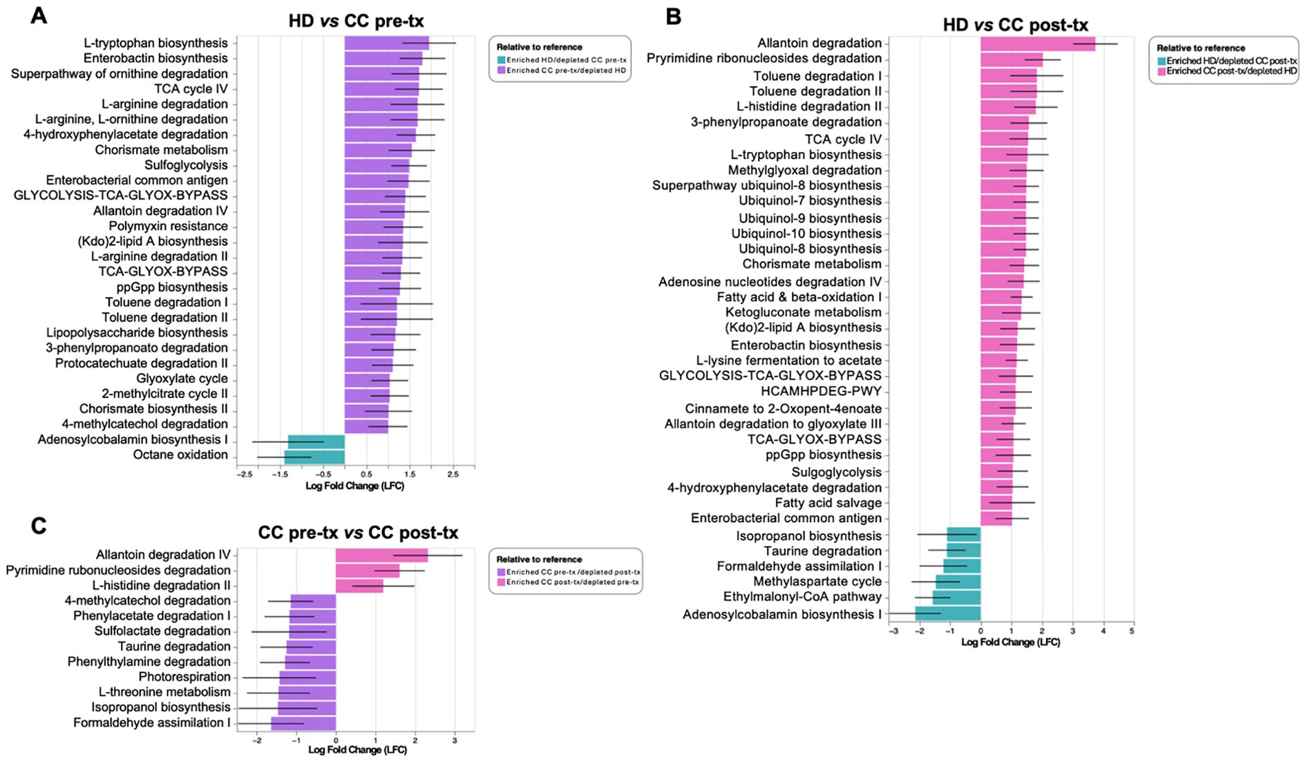 Figure 4. Predictive analysis of metabolic pathways in gut microbiota from fecal samples of healthy donors (HD), CC patients before treatment (CC pre-tx), and CC patients after treatment (CC post-tx). (A) Comparison of HD vs. CC pre-tx, (B) Comparison of HD vs. CC post-tx, and (C) Comparison of CC pre-tx vs. CC post-tx. Blue bars represent metabolic pathways enriched in HD, purple bars in CC pre-tx, and pink bars in CC post-tx. Bars indicate the LFC obtained by PICRUSt2 analysis between study groups, using an LFC cutoff of ±1.LFC, Log Fold Change; PICRUSt2, Phylogenetic Investigation of Communities by Reconstruction of Unobserved States 2.