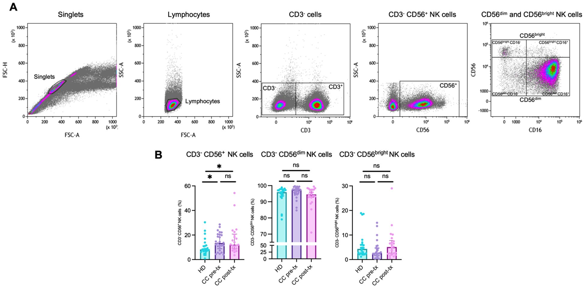 Figure 5. Flow cytometry analysis of NK cell populations in peripheral blood from healthy donors (HD), CC patients before treatment (CC pre-tx), and CC after antineoplastic treatment (CC post-tx). (A) Flow cytometry analysis strategy for NK cell populations. (B) Percentages of total NK cells (CD3-CD56+), CD3-CD56dim NK cells, and CD3-CD56bright NK cells in peripheral blood across the study groups. Comparisons between groups were performed using the Kruskal-Wallis test for non-parametric data, followed by the Benjamini-Hochberg FDR method for multiple comparison correction. Frequency data are presented as individual expression percentages and median with IQR. *p ≤ 0.05.