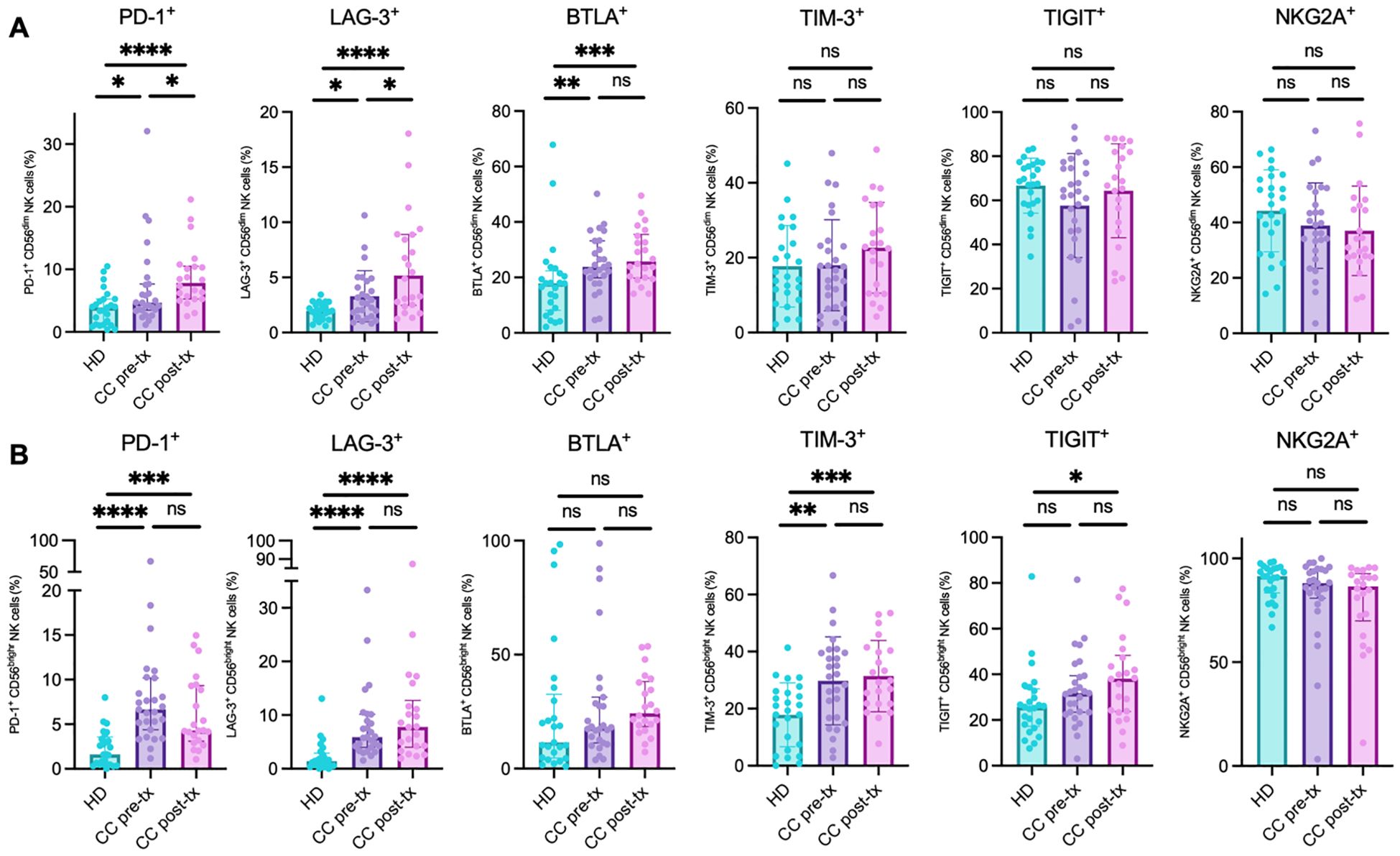Figure 6. Analysis of immune checkpoint marker analysis in NK cell populations from peripheral blood of healthy donors (HD), CC patients before treatment (CC pre-tx), and CC patients after treatment (CC post-tx). (A) Percentage of peripheral CD56dim NK cells expressing inhibitory immune checkpoints. (B) Percentage of peripheral CD56bright NK cells expressing immune checkpoints: PD-1, LAG-3, BTLA, TIM-3, TIGIT, and NKG2A. Comparisons between groups were performed using one-way ANOVA for parametric variables: TIM-3 CD56dim and CD56bright, TIGIT CD56dim, and NKG2A CD56dim. Kruskal-Wallis was applied for non-parametric variables: PD-1 CD56dim and CD56bright, LAG-3 CD56dim and CD56bright, BTLA CD56dim and CD56bright, TIGIT CD56bright, and NKG2A CD56bright. All tests were corrected for multiple comparisons using the Benjamini–Hochberg FDR method. Data are shown as individual percentages of cells expressing each receptor as mean ± SD for parametric variables and median with IQR for non-parametric variables. *p ≤ 0.05, **p≤ 0.01, ***p ≤0.001, ****p ≤0.0001.