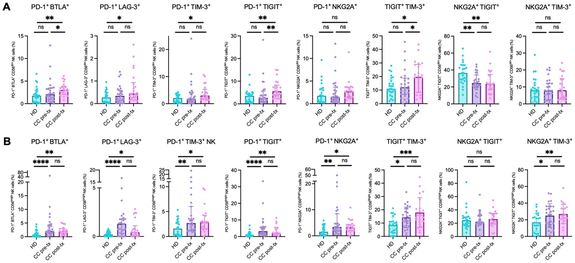 Figure 7. Co-expression of inhibitory immune checkpoint markers in NK cells from peripheral blood of healthy donors (HD), CC patients before treatment (CC pre-tx), and CC patients after treatment (CC post-tx). (A) Percentage of peripheral CD56dim NK cells expressing co-inhibitory immune checkpoints. (B) Percentage of peripheral CD56bright NK cells expressing co-inhibitory immune checkpoints: PD-1+BTLA+, PD-1+LAG-3+, PD-1+TIM-3+, PD-1+TIGIT+, TIGIT+TIM-3+, NKG2A+TIGIT+, PD-1+NKG2A+, and NKG2A+TIM-3+. Comparisons between groups were performed using one-way ANOVA for parametric variables: NKG2A+TIM-3+ CD56dim and CD56bright and TIGIT+TIM-3+ CD56bright, and Kruskal-Wallis for all other analyzed co-expressions, followed by Benjamini-Hochberg FDR correction for multiple comparisons. Data is shown as individual percentages of cells positive for co-expression with mean ± SD for parametric variables and median with IQR for non-parametric variables. *p ≤ 0.05, **p≤ 0.01, ***p ≤0.001, ****p ≤0.0001.