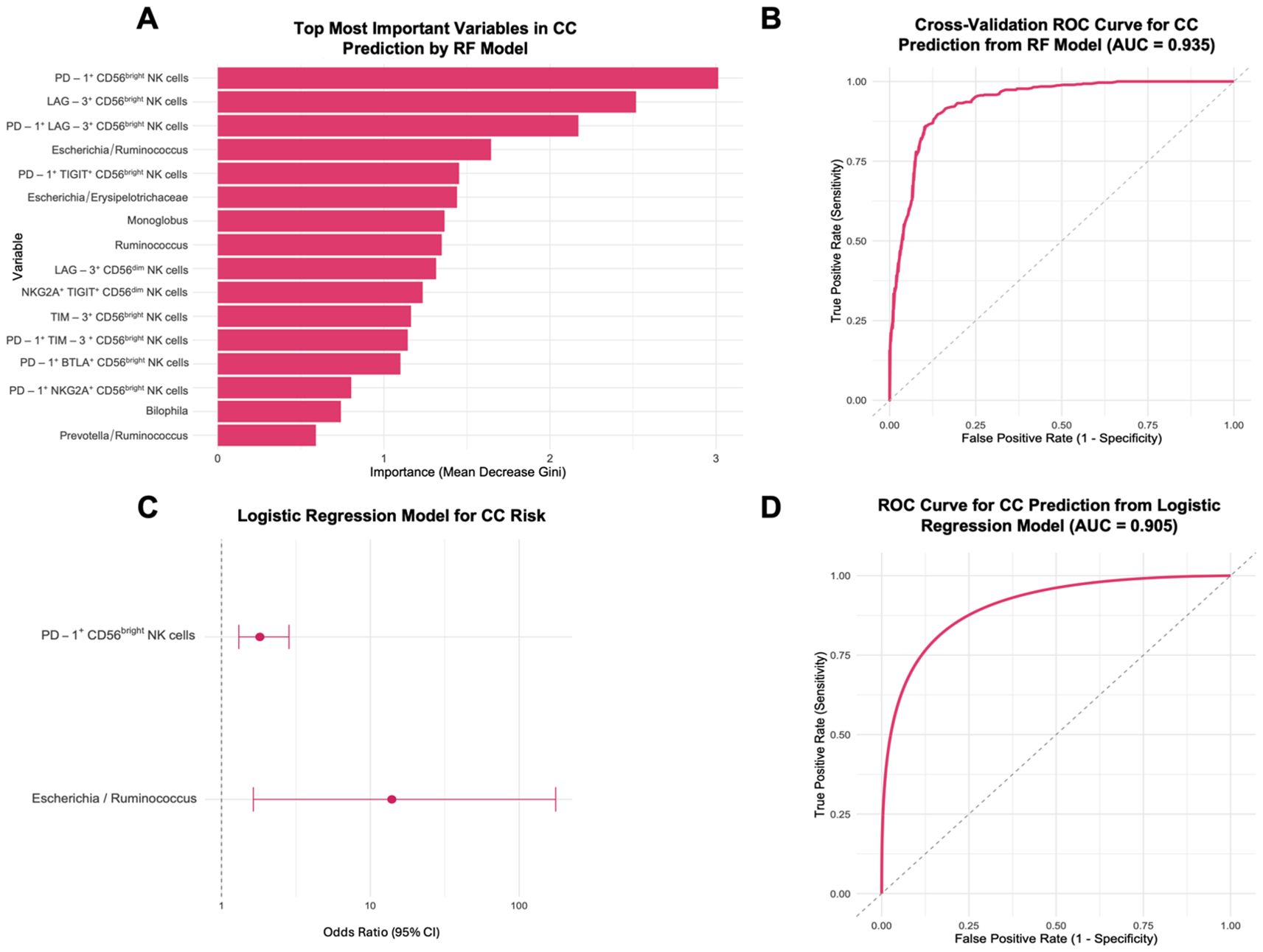 Figure 8. Prediction of CC risk using a Random Forest model and logistic regression from healthy donors (HD), and CC patients before treatment (CC pre-tx). (A) Top 16 most important variables from 104 tested for CC prediction: The most important variables in predicting CC risk are displayed according to the RF model’s Mean Decrease Gini scores. (B) ROC Curve for CC prediction from RF. (C) Forest Plot for factors associated with CC risk: OR and 95% CI from a logistic regression model using PD-1+ CD56bright NK cells and Escherichia/Ruminococcus ratio for CC risk. (D) ROC Curve for CC prediction from logistic regression model. RF, Random Forest; ROC, Receiver Operating Characteristic; CI, confidence intervals; OR, Odds ratio.