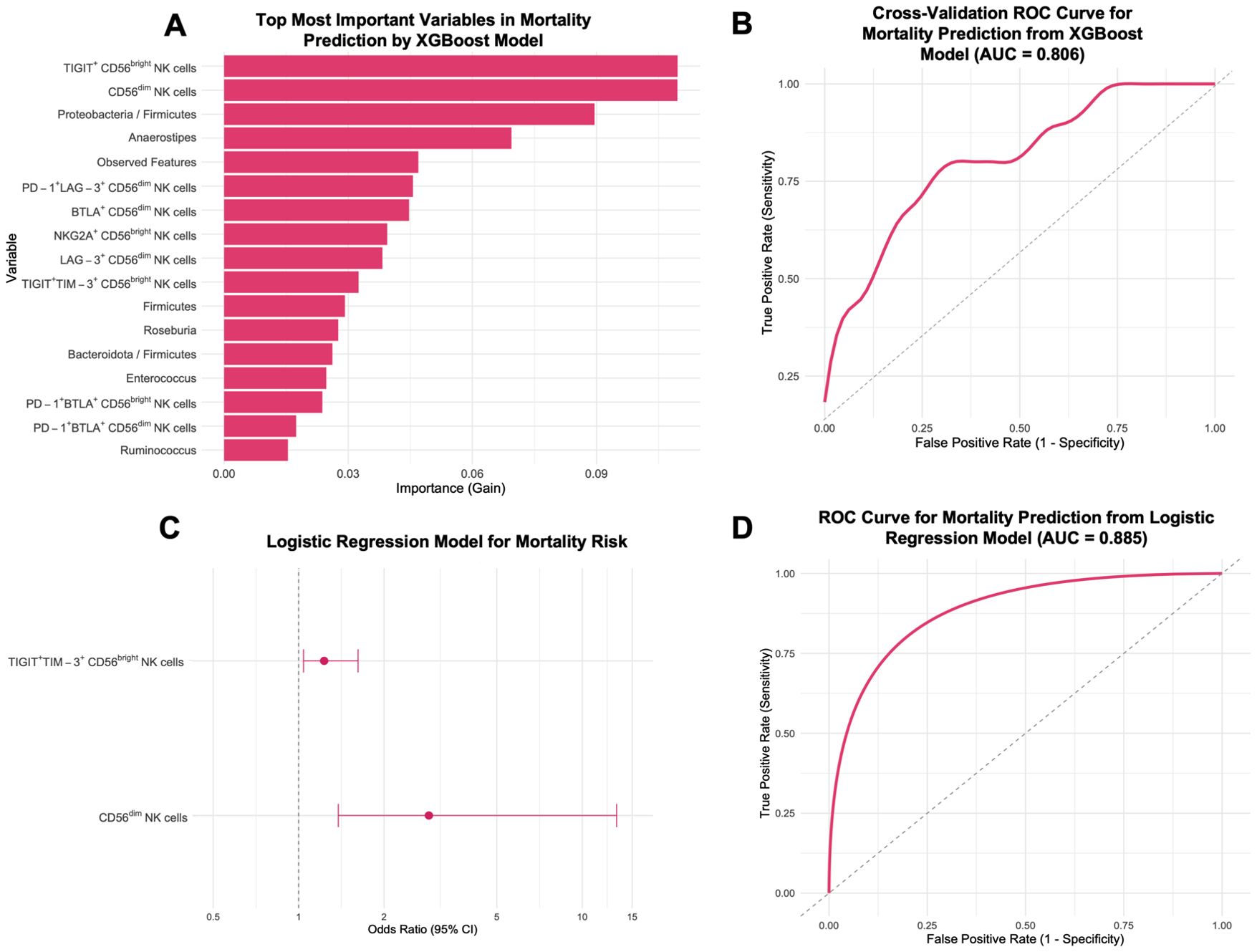 A second logistic regression using TIGIT+TIM-3+ CD56bright NK cells and Proteobacteria/Firmicutes (log) ratio did not reveal any statistically significant associations with mortality (Supplementary Figure 9A). The combined model yielded an AUC of 0.823 (Supplementary Figure 9B), but these findings should be considered preliminary.