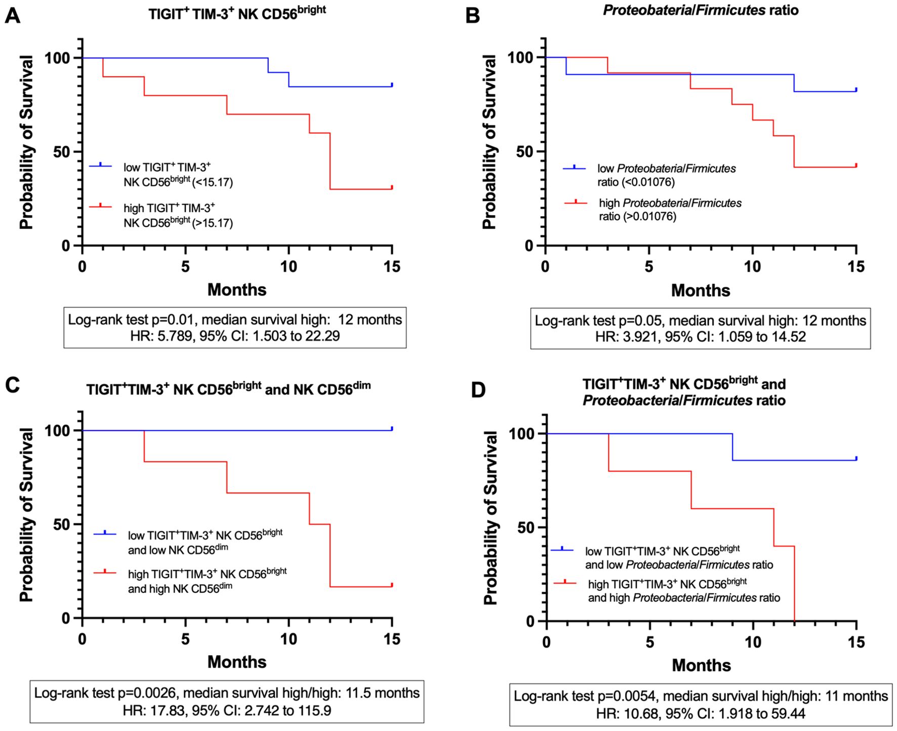 Combined survival analyses were conducted to assess synergistic effects; as these analyses were restricted to extreme categories (high/high vs. low/low variables), the effective sample size was reduced. Patients with high levels of both TIGIT+TIM-3+ expression on CD56bright NK cells and a high frequency of CD56dim NK cells had a significantly reduced survival with a mean of 11.5 months (Mantel-Haenszel HR = 17.83, 95% CI: 2.742-115.9, log-rank p = 0.0026) compared to those with low levels of both variables. In this comparison, 5 deaths occurred in the high/high group, whereas no deaths were observed in the low/low group; 7 patients in the low/low group and 1 in the high/high group were censored at 15 months (Figure 10C). Similarly, patients presenting both high TIGIT+TIM-3+ expression on CD56bright NK cells and a high Proteobacteria/Firmicutes ratio exhibited significantly reduced survival, with a mean of 11 months (HR = 10.68, 95% CI: 1.918-59.44, log-rank p = 0.0054), compared to patients with low values for both markers. For this variable combination, 5 deaths occurred in the high/high group and 1 in the low/low group, while 6 patients in the low/low group and none in the high/high group were censored at 15 months (Figure 10D).