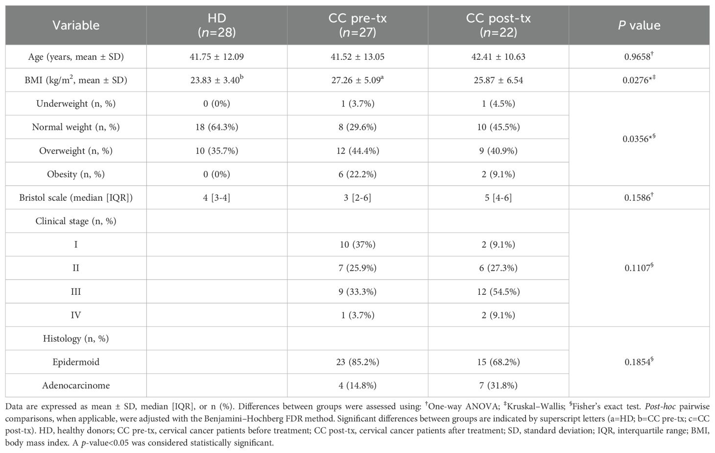 Inclusion criteria for the CC group were: (i) age ≥18 years, (ii) histopathologically confirmed cervical cancer (stages I–IV, classified by TNM system), and (iii) provision of informed consent. Exclusion criteria for all participants included: (i) use of prebiotics or probiotics within four weeks before recruitment, (ii) any chronic infection other than HPV, (iii) hospitalization within the past three months due to COVID-19-related illness, (iv) diagnosed gastrointestinal disorders, (v) autoimmune diseases and (vi) pregnancy.