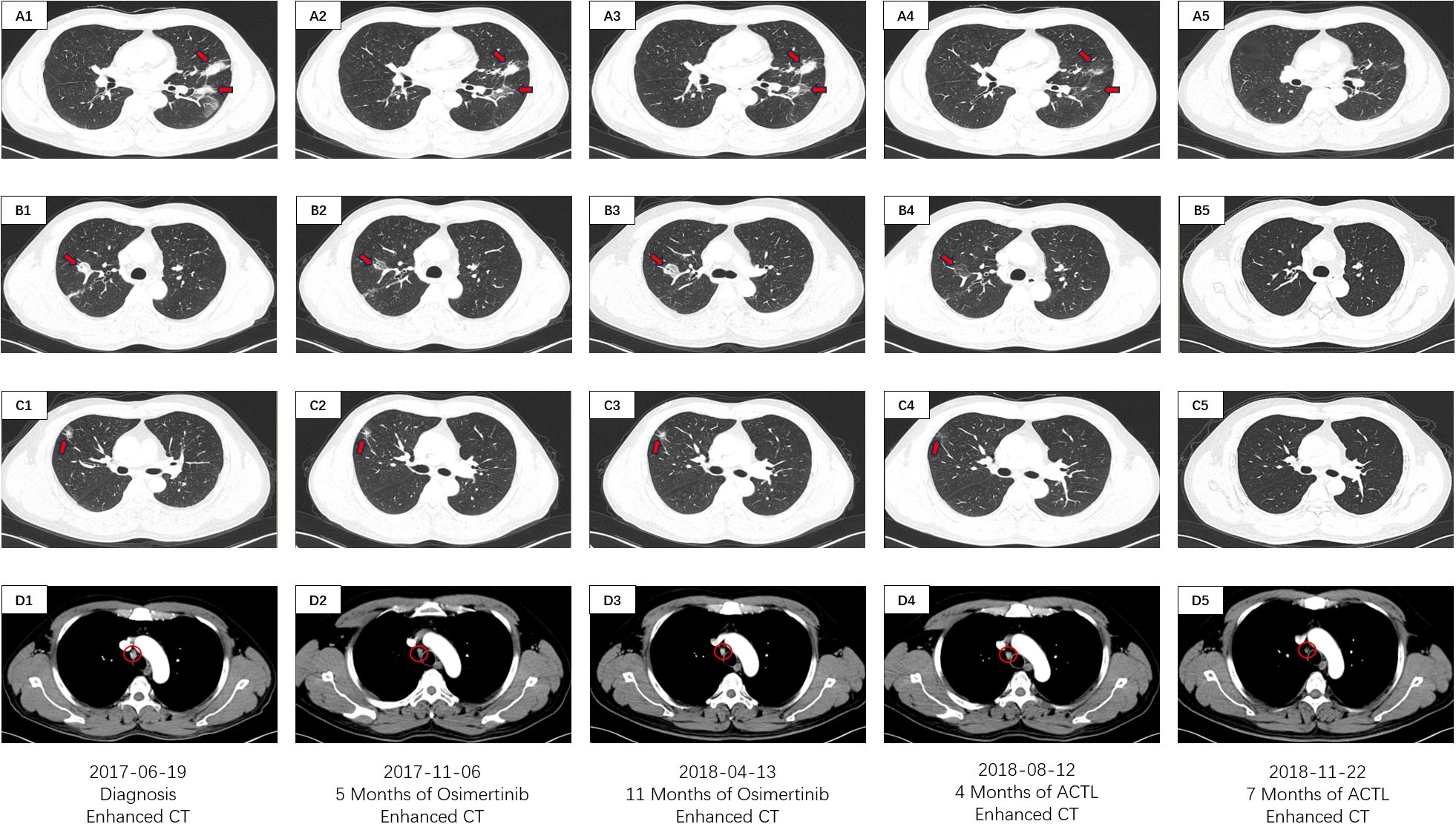 Against the above background, this case report describes a patient with advanced EGFR-mutant lung adenocarcinoma who developed acquired resistance to osimertinib with unknown mechanisms. The patient received ACTL therapy and ultimately achieved a cCR and maintained it for 6 years of follow-up. This case confirms that ACTL can break through the barrier of tumor heterogeneity and eliminate drug-resistant clones unrecognizable by traditional techniques. According to previous studies and this case, the acquired resistance to EGFR-TKIs is to some extent associated with the immunosuppressive state of the TME (14). ACTL not only achieves the remodeling and reversal of the immune microenvironment during treatment, but the long-term immune effect it induces also provides new evidence for the “curative treatment” of advanced lung cancer.