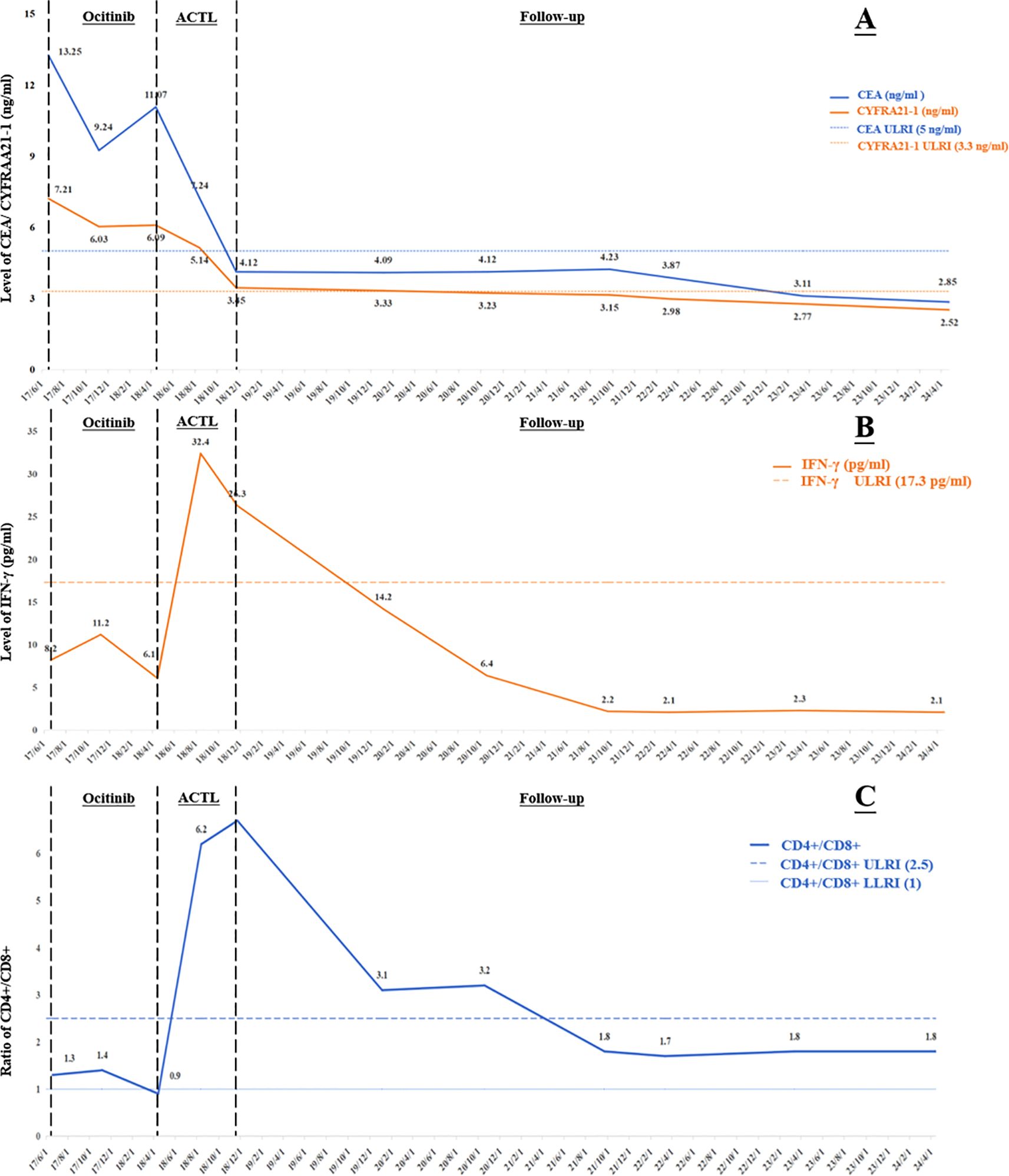 Figure 2. Change curves during treatment of: (A) tumor markers; (B) the cytokine index IFN-γ; (C) the lymphoid subset detection index CD4+/CD8+. CEA, carcinoembryonic antigen; CYFRA 21-1, cytokeratin 19 fragment; IFN-γ, Interferon-γ; ULRI, Upper limit of reference interval; LLRI, lower limit of reference interval; ACTL, antigen-specific cytotoxic T lymphocyte.