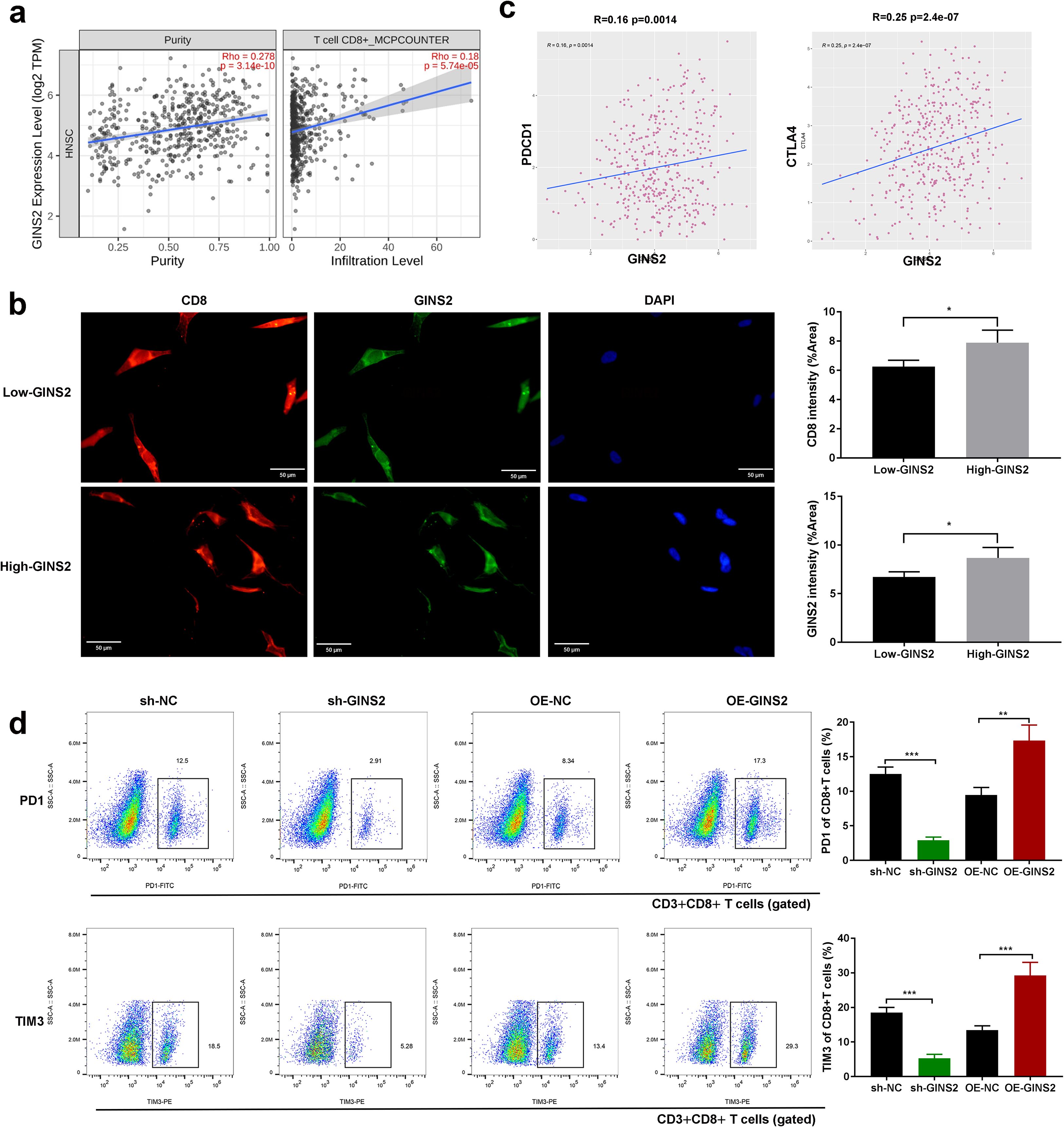 The analyses in this subsection interrogate tumor microenvironmental/immune correlates rather than cell-autonomous tumor properties. Recognizing the crucial role of the TME in cancer progression, we investigated the relationship between GINS2 expression and immune infiltration in OSCC using TCGA data analyzed via TIMER2.0. GINS2 expression showed significant positive correlation with estimated tumor purity (Rho=0.278, Figure 1a, left panel), and also exhibited a significant negative correlation with CD8+ T cell infiltration levels estimated by the MCP-counter algorithm (Rho=0.18, Figure 1a, right panel). Consistent with a broader cytotoxic compartment, GINS2 also showed a weak but significant correlation with NK-cell infiltration estimated by MCP-counter (ρ = 0.126, p = 5.14×10-³; Supplementary Figure S2). However, further analysis revealed significant positive correlations between GINS2 expression levels (log2 TPM) and the expression of key T cell exhaustion markers, including PDCD1 (encoding PD-1), LAG3, and CTLA4, in the HNSC cohort (Figure 1c). Immunofluorescence of patient OSCC sections identified CD8+ tumor-infiltrating lymphocytes (TILs); epithelial tumor cells (GINS2+) showed no CD8 signal. High-GINS2 cases displayed higher CD8+ TIL signal than Low-GINS2 cases (Figure 1b), suggesting potential regulation or co-enrichment. To functionally link GINS2 to T cell exhaustion phenotype, we performed flow cytometry on antigen-specific CD8+ T cells co-cultured with OSCC (HN6/SCC25) cells manipulated for GINS2 expression. Flow cytometry readouts are from CD3+CD8+ T cells gated within the lymphocyte compartment; OSCC cells lack CD3/CD8 and are excluded by lineage and scatter gates. Knockdown of GINS2 (sh-GINS2) led to a significant decrease in the percentage of CD8+ T cells expressing the exhaustion markers PD-1 and TIM3 compared to co-culture with control (sh-NC) OSCC cells. Conversely, overexpression of GINS2 (OE-GINS2) significantly increased the percentage of CD8+ T cells positive for PD-1 and TIM3 (Figure 1d). Immunofluorescence on patient tumors showed that High-GINS2 cases (H-score ≥ median) displayed higher CD8 signal than Low-GINS2 cases (H-score < median) (Figure 1b).