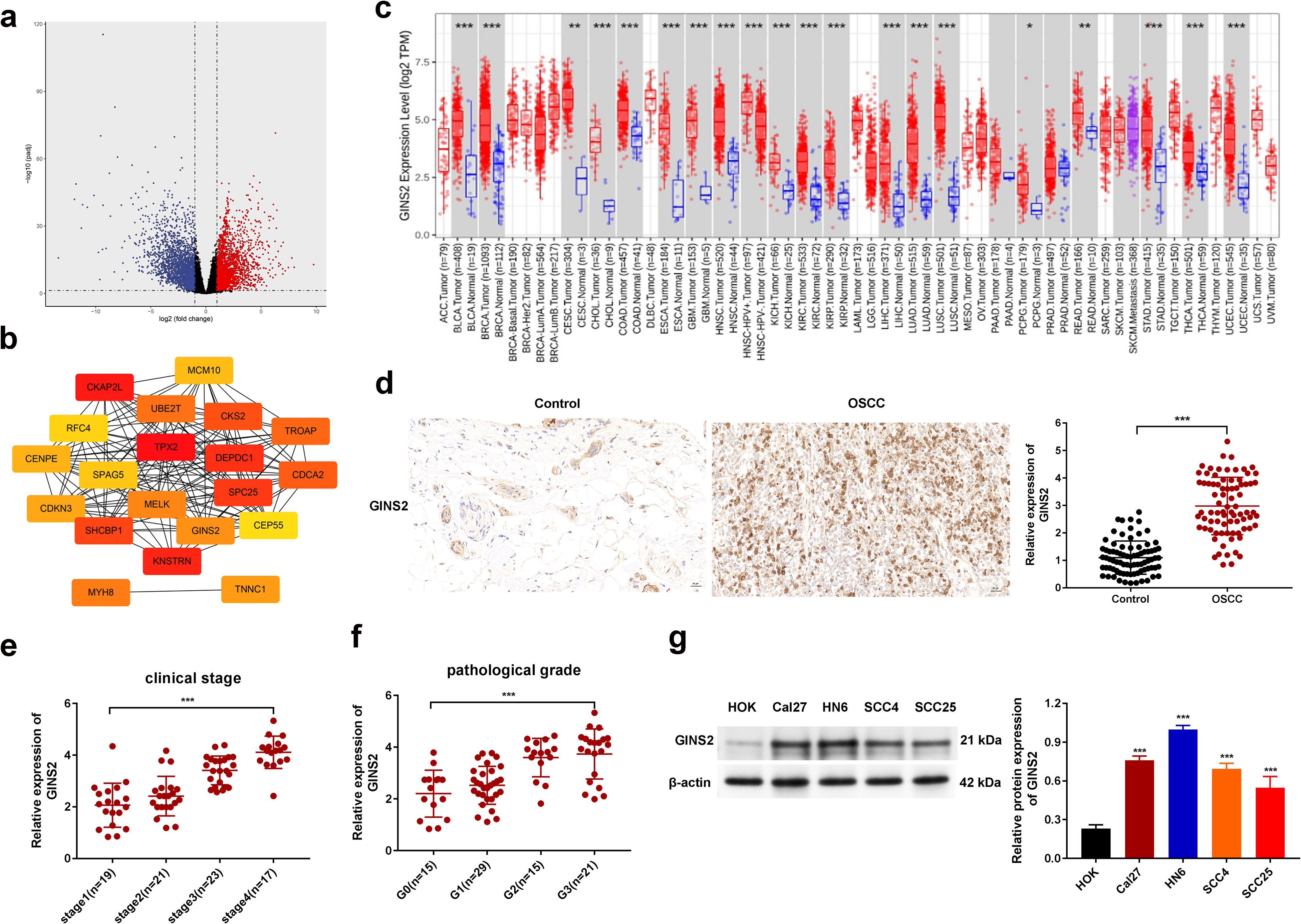 Figure 2. GINS2 is upregulated in OSCC and correlates with adverse clinicopathological features. (a) Volcano plot showing differentially expressed genes between HNSC tumor tissues and normal tissues from TCGA database. (b) STRING PPI network of prognostic DEGs (|log2FC| > 2; FDR < 0.05; survival-associated). Genes not present in the seed (e.g., PTP4A1, PKM) are not displayed. The panel is intended to position GINS2 within replication/cell-cycle interactors. (c) Pan-cancer analysis from TCGA showing GINS2 mRNA expression (log2 TPM) across cancer types (red) versus normal tissues (blue). (d) Representative IHC images (left) and quantification (right) of GINS2 expression in OSCC versus controls. Scale bar = 50 µm. (e) Relative GINS2 mRNA expression stratified by clinical stage (qPCR; OSCC patient samples). (f) Relative GINS2 mRNA expression stratified by pathological grade (qPCR; OSCC patient samples). (g) Western blot (left) and quantification (right) demonstrating GINS2 protein expression in multiple OSCC cell lines (Cal27, HN6, SCC4, SCC25) compared to normal human oral keratinocytes (HOK). β-actin served as the loading control. Data in plots are presented as mean ± SD or box plots showing median and interquartile range. *P < 0.05, **P < 0.01, ***P < 0.001.