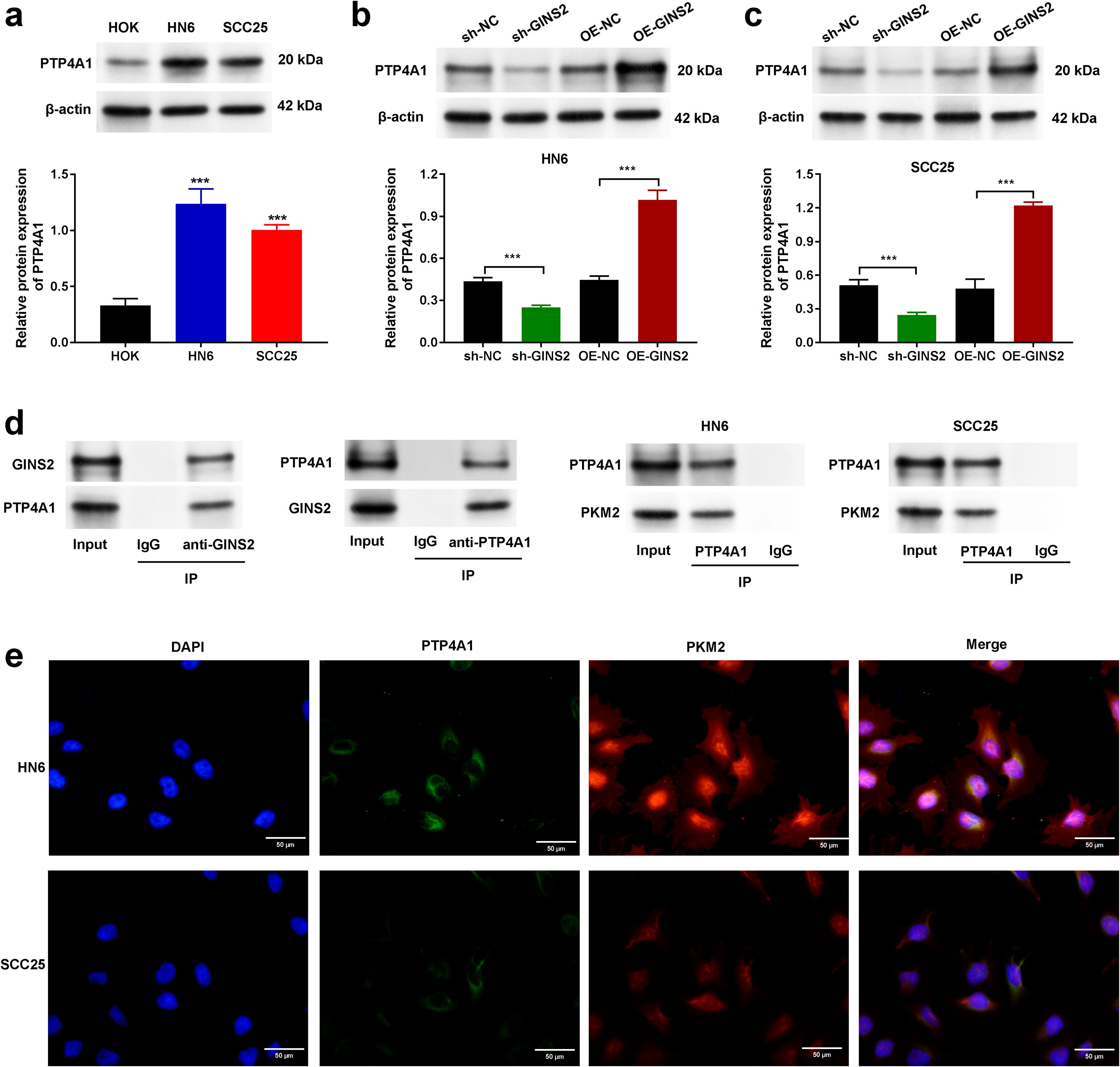 Figure 3. GINS2 interacts with PTP4A1 and regulates its expression, and PTP4A1 interacts with PKM2 in OSCC cells. (a) Western blot analysis showing baseline protein expression of PTP4A1 in normal human oral keratinocytes (HOK) and OSCC cell lines HN6 and SCC25. β-actin served as the loading control. Bar graph shows quantification relative to HOK. (b, c) Western blot analysis (top) and quantification (bottom) demonstrating the effect of GINS2 knockdown (sh-GINS2) or overexpression (OE-GINS2) on PTP4A1 protein levels in HN6 (b) and SCC25 (c) cells, compared to respective controls (sh-NC, OE-NC). β-actin served as the loading control. (d) Co-immunoprecipitation (Co-IP) assays. Left panels: Interaction between endogenous GINS2 and PTP4A1 in HN6 cells. IP with anti-GINS2 pulls down PTP4A1, and IP with anti-PTP4A1 pulls down GINS2. Right panels: Interaction between endogenous PTP4A1 and PKM2 in HN6 and SCC25 cells. IP with anti-PTP4A1 pulls down PKM2. Control IgG IPs and input lysates are shown. (e) Immunofluorescence staining showing co-localization of PTP4A1 (green) and PKM2 (red) in HN6 and SCC25 cells. Nuclei are stained with DAPI (blue). Scale bar = 20 µm. Data in bar graphs are presented as mean ± SD. ***P < 0.001.