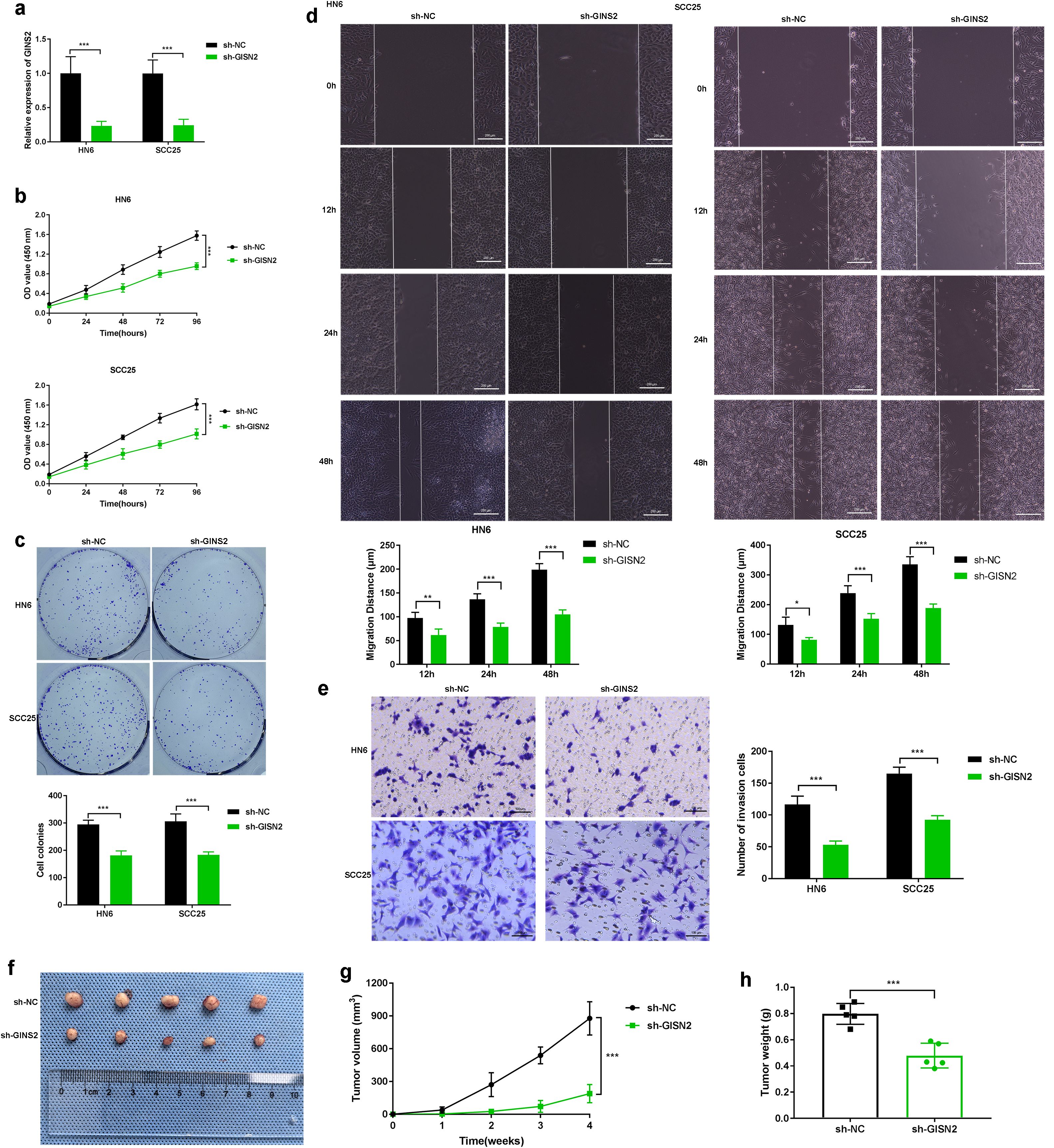 Figure 4. GINS2 promotes OSCC proliferation, migration, invasion, and tumorigenesis. (a) qPCR confirming efficient knockdown of GINS2 mRNA in HN6 and SCC25 cells after sh-GINS2 transfection compared to sh-NC. β-actin was used for normalization. (b) CCK-8 assay over 96 hours showing reduced viability of HN6 and SCC25 cells upon GINS2 knockdown. (c) Colony formation assay images (top) and quantification (bottom) demonstrating fewer and smaller colonies after GINS2 silencing. (d) Wound-healing assay images (0 h, 12 h, 24 h, and 48 h) and quantification showing impaired migration. Scale bar = 200 µm. (e) Transwell Matrigel invasion assay images (left) and quantification (right) showing reduced invasion after GINS2 silencing. Invaded cells stained with crystal violet. Scale bar = 100 µm. (f–h) Effect of GINS2 knockdown on OSCC tumor growth in vivo. Representative xenograft images (f), tumor growth curves (g), and final tumor weight (h) showing suppressed tumorigenesis in sh-GINS2 vs sh-NC HN6 cells. Data are presented as mean ± SD. ***P < 0.001. n = 5 mice per group.