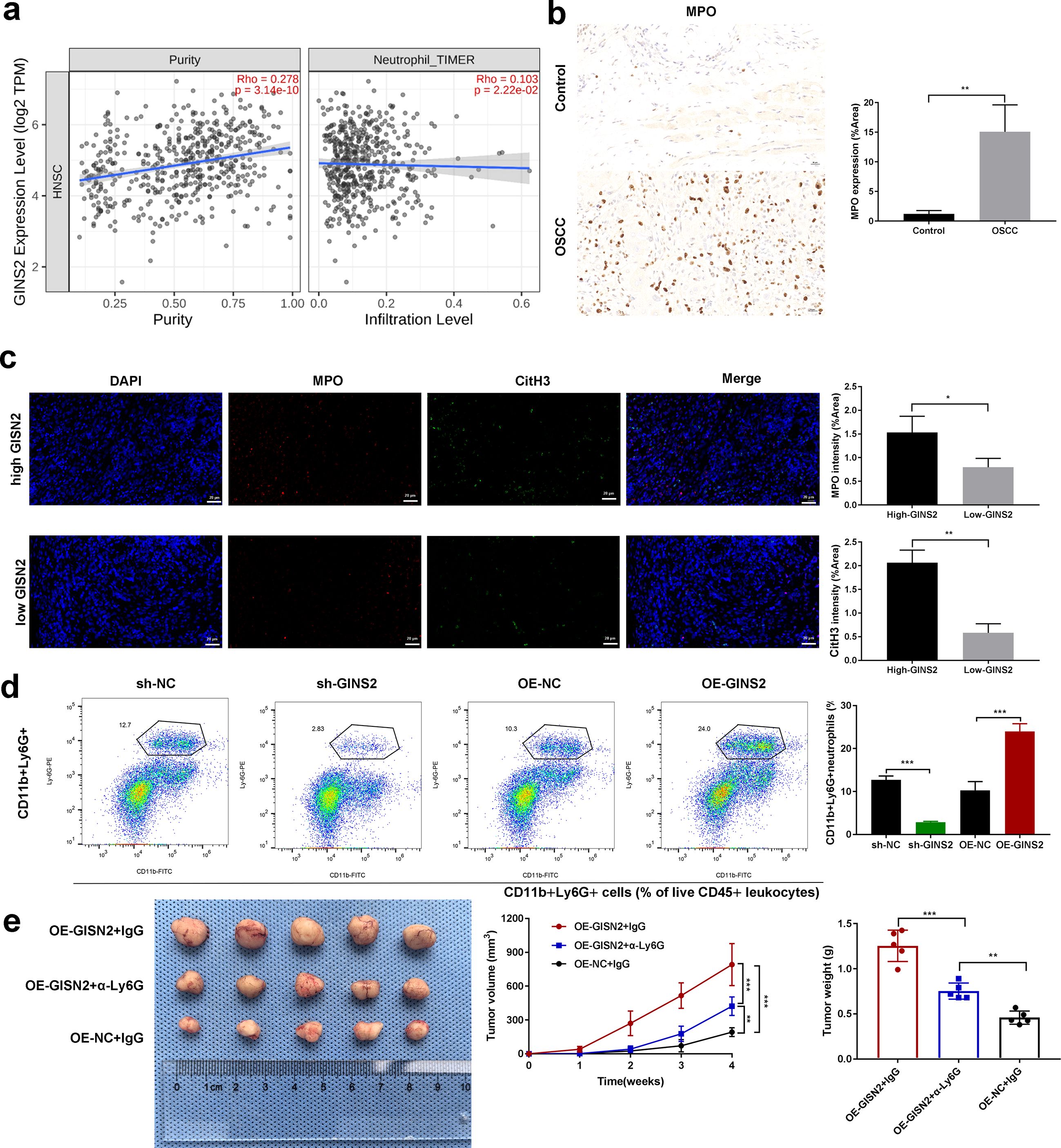 Figure 5. GINS2 expression correlates with neutrophil infiltration, GINS2 promotes TAN accumulation, and neutrophil depletion impairs GINS2-driven tumor growth. (a) Correlation analyses using TIMER2.0 database in the HNSC cohort. Left: Scatter plot showing correlation between GINS2 expression level (log2 TPM) and estimated tumor purity. Right: Scatter plot showing correlation between GINS2 expression level and neutrophil infiltration level estimated by the TIMER algorithm. Spearman’s rho and P-value are indicated. (b) Left: Representative immunohistochemistry (IHC) staining for Myeloperoxidase (MPO) in control oral tissue and OSCC tissue, showing increased neutrophil infiltration in OSCC. Right: Quantification of MPO expression (% Area) from IHC images (n=5 per group). Scale bar = 50 µm. (c) Left: Representative immunofluorescence images showing staining for MPO (red) and citrullinated histone H3 (CitH3, green) in OSCC tissue sections. Nuclei are stained with DAPI (blue). Merged images suggest potential NET formation. Right: corresponding quantification. Scale bar = 50 µm. (d) Flow cytometry analysis quantifying the percentage of CD11b+Ly6G+ neutrophils within subcutaneous xenograft tumors derived from HN6 cells transfected with sh-NC, sh-GINS2, OE-NC, or OE-GINS2. Gating strategy: live (viability dye-) → CD45+ leukocytes → CD11b+Ly6G+ neutrophils. Readout: %CD11b+Ly6G+ of CD45+ cells within the tumor digest. Representative flow plots (left) and quantification (right) are shown. (e) Effect of neutrophil depletion on GINS2-driven tumor growth in vivo. Representative images of subcutaneous xenograft tumors derived from OE-GINS2 HN6 cells in nude mice treated with control IgG or anti-Ly6G antibody (left), and quantification of tumor volume (middle) over time and final tumor weight (right). Data are presented as mean ± SD. **P < 0.01, ***P < 0.001.