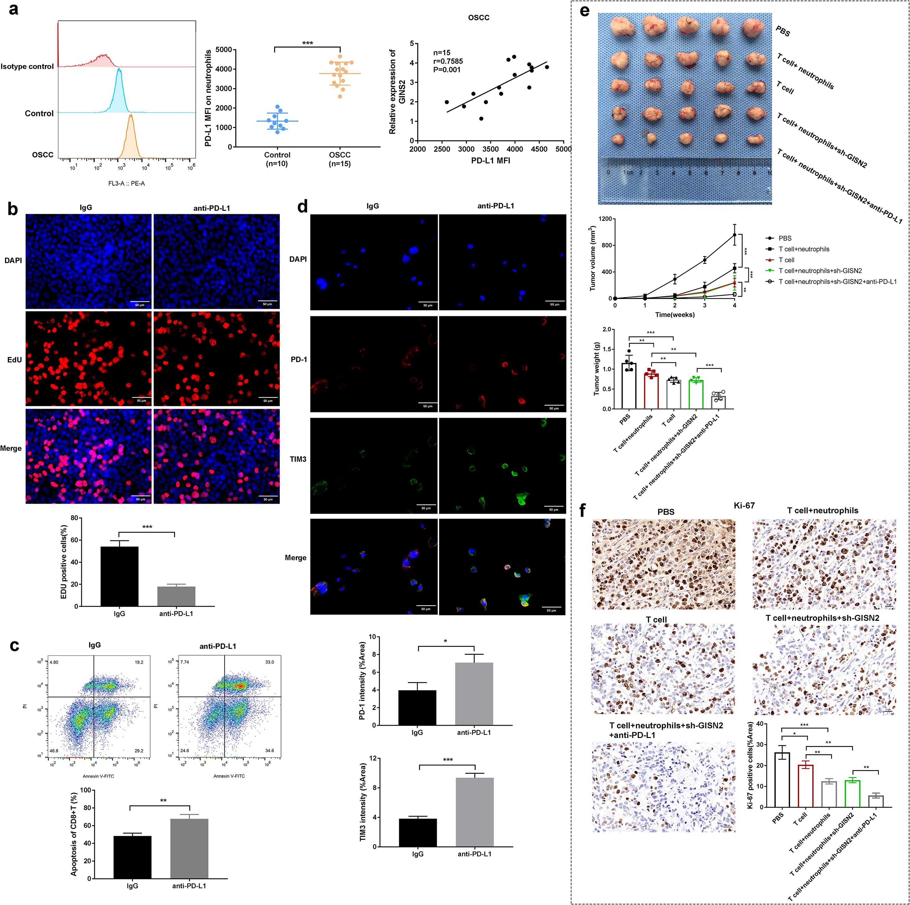 Figure 6. GINS2-associated neutrophils express PD-L1, mediating immunosuppression, and targeting GINS2 synergizes with anti-PD-L1 therapy in vivo. (a) Left: Representative flow cytometry histogram showing higher PD-L1 surface expression (MFI) on neutrophils from OSCC environment compared to control. (a) Right: Dot plot showing a significant positive correlation between GINS2 relative expression (in matched tumors) and PD-L1 MFI on associated neutrophils (n = 15 matched OSCC cases, Spearman correlation). Gating strategy: live (viability dye-) → CD66b+ neutrophils → PD-L1 (PE-conjugated) histogram/overlay. Readouts: PD-L1 MFI and %PD-L1+ among CD66b+ cells (FMO-anchored). (b) EdU incorporation assay assessing proliferation of CD8+ T cells co-cultured with neutrophils +/- anti-PD-L1 antibody or control IgG. Representative images (upper) and quantification (lower) show increased T cell proliferation upon PD-L1 blockade. Scale bar = 50 µm. (c) Flow cytometry analysis assessing apoptosis (Annexin V-FITC/PI staining) of CD8+ T cells after co-culture and treatment with control IgG or anti-PD-L1 antibody. Upper: Representative flow plots. Lower: Quantification of the percentage of apoptotic (Annexin V+) CD8+ T cells. Gating strategy: lymphocytes (FSC-A vs SSC-A) → singlets (FSC-H/FSC-A) → live (viability dye-) → CD3+CD8+ T cells → Annexin V-FITC vs PI. Readouts: %Annexin V+ (early + late apoptosis) among CD3+CD8+ cells; PI used to distinguish early (Annexin V+/PI-) vs late (Annexin V+/PI+) apoptosis when reported. (d) Representative immunofluorescence images showing expression of PD-1 (red) and TIM-3 (green) on cells (likely T cells) within the tumor microenvironment. Nuclei are stained with DAPI (blue). Scale bar = 50 µm. (e) In vivo therapeutic efficacy study using NOD/SCID mice reconstituted with human T cells and neutrophils, injected with sh-GINS2 HN6 cells, and treated with PBS, control IgG, or anti-PD-L1 antibody. Representative images of excised tumors (upper), and quantification of tumor volume over time (middle) and final tumor weight (lower) across different groups: PBS, T cell only, T cell+neutrophils, T cell+neutrophils+sh-GINS2, T cell+neutrophils+sh-GINS2+anti-PD-L1. (f) Representative IHC staining for Ki67 in xenograft tumors from the different treatment groups in the in vivo study described in (d). Scale bar = 50 µm. Data are presented as mean ± SD. *P < 0.05, **P < 0.01, ***P < 0.001.