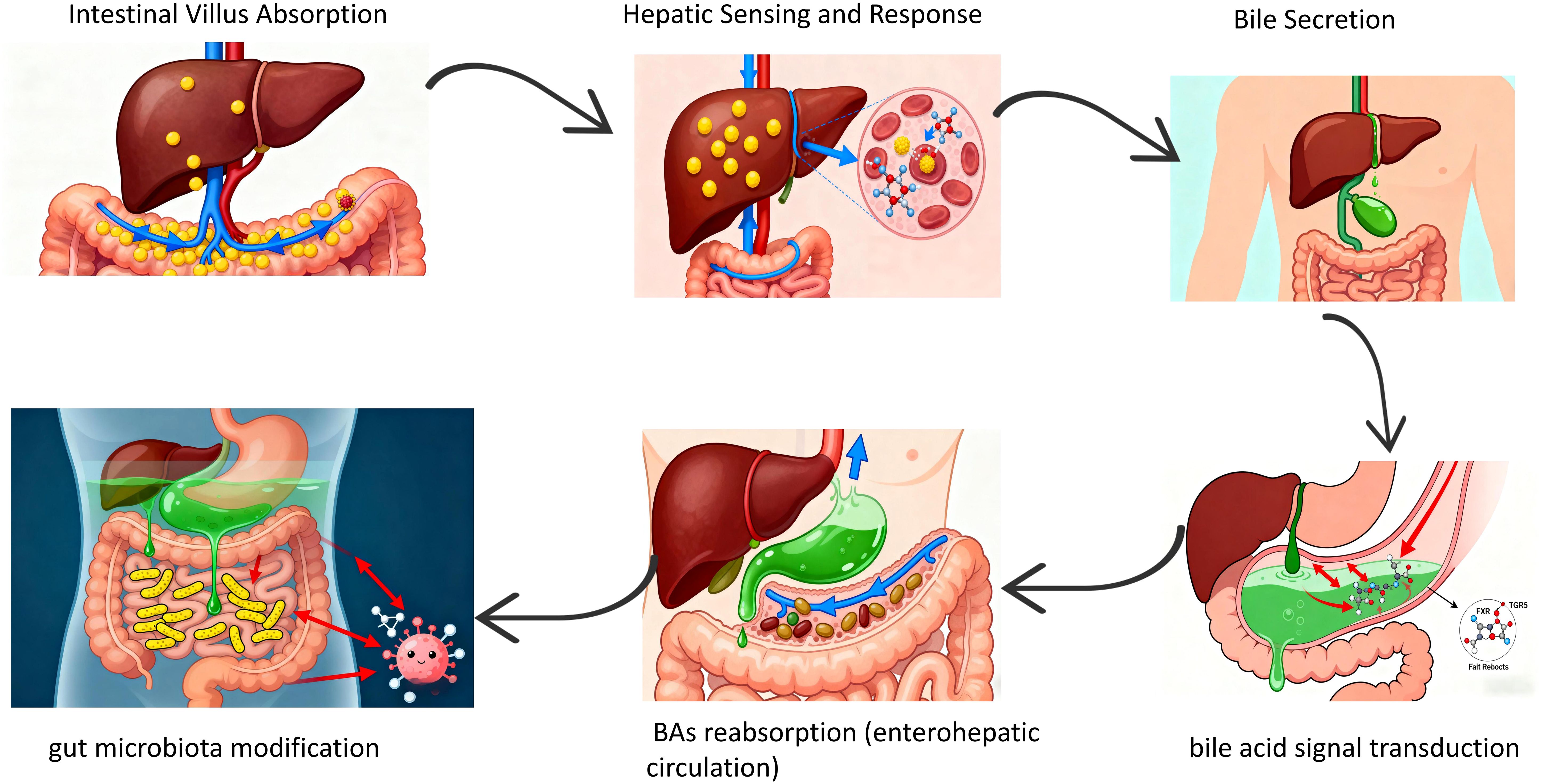The liver receives blood enriched in nutrients, dietary and microbial antigens directly from the intestine via the hepatic portal vein. This anatomical connection enables the liver to sense and respond to macronutrients, microbial metabolites, toxins, and other signaling molecules derived from the gastrointestinal tract. Conversely, the liver secretes bile and additional bioactive factors into the duodenum of the small intestine, which not only facilitates the digestion and absorption of dietary fats but also transduces signals through bile acid (BAs)-specific receptors, including farnesoid X receptor (FXR) and Takeda G protein-coupled receptor 5 (TGR5), among others (19). BAs, a critical component of bile, play a vital role in intestinal digestion and absorption of lipids and fat-soluble vitamins (20). BAs are reabsorbed in the ileum via active transport proteins and returned to the liver through the portal vein—a process termed the “enterohepatic circulation” (21), which is essential for maintaining stable bile composition and normal bile secretion. These BAs are stored in the gallbladder or secreted into the duodenum to facilitate lipid absorption. Most are reabsorbed in the terminal ileum via active transport, while partially modified secondary BAs generate various isomers regulated by gut bacteria in the ileum and colon. These isomers may potentially regulate immune, inflammatory, and endocrine homeostasis (22–24) (Figure 3).