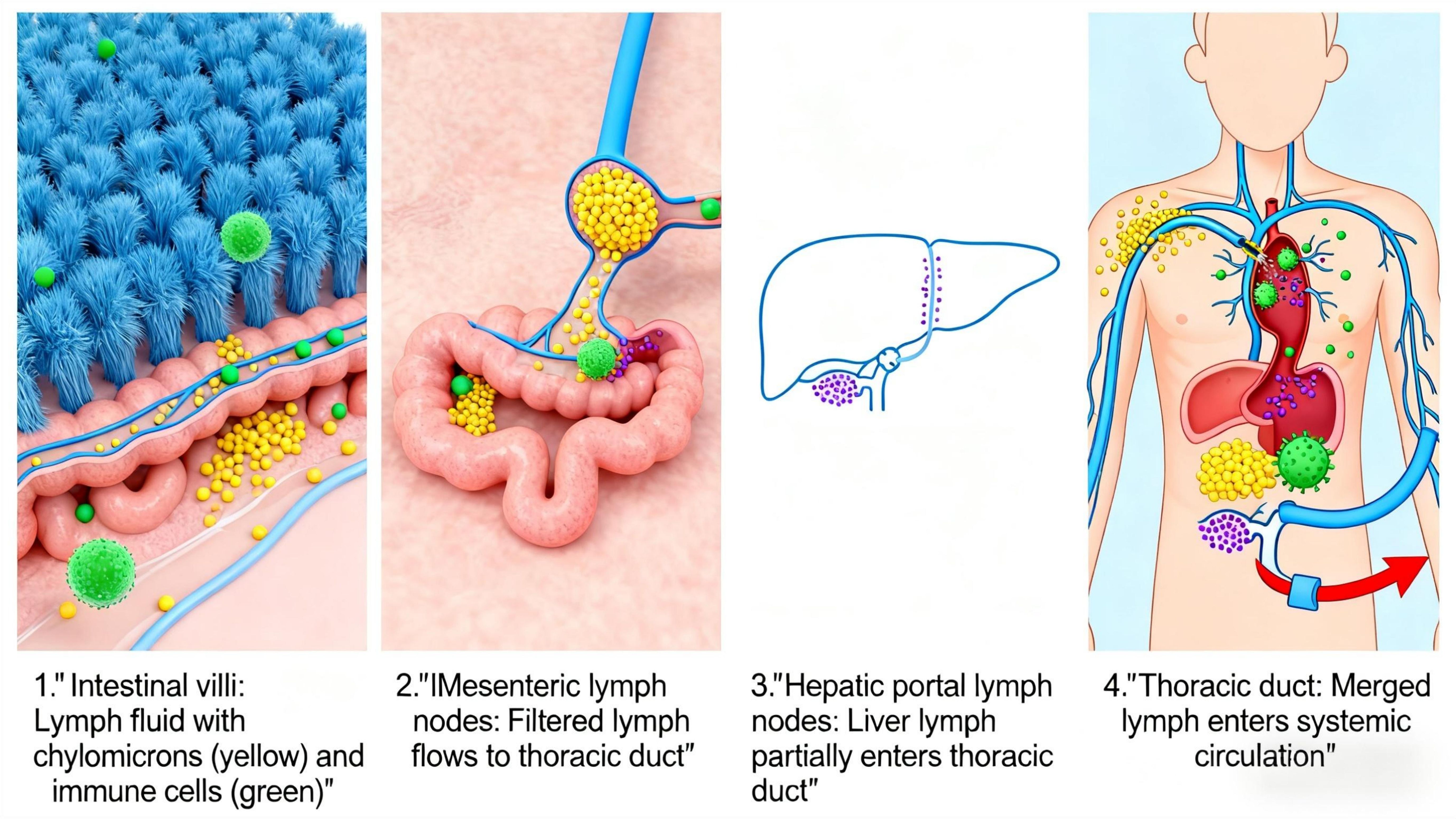 In the intestine, lymphatic fluid is rich in diet-derived lipids incorporated into chylomicrons and gut-specific immune cells. Intestinal lymphatic vessels are therefore critical for systemic delivery of dietary lipids and metabolic regulation (29). Metabolites from dietary compounds and the gut microbiome can enter the lymphatic system to modulate distal organs like the liver (30). The hepatic and intestinal lymphatic systems are interconnected: Intestinal lymph contains substances such as fat particles and immunoglobulins, which converge through mesenteric lymph nodes into the thoracic duct before entering the bloodstream. Hepatic lymph drains via hepatic portal lymph nodes, with some flowing into the thoracic duct and the rest directly entering the bloodstream (Figure 4).