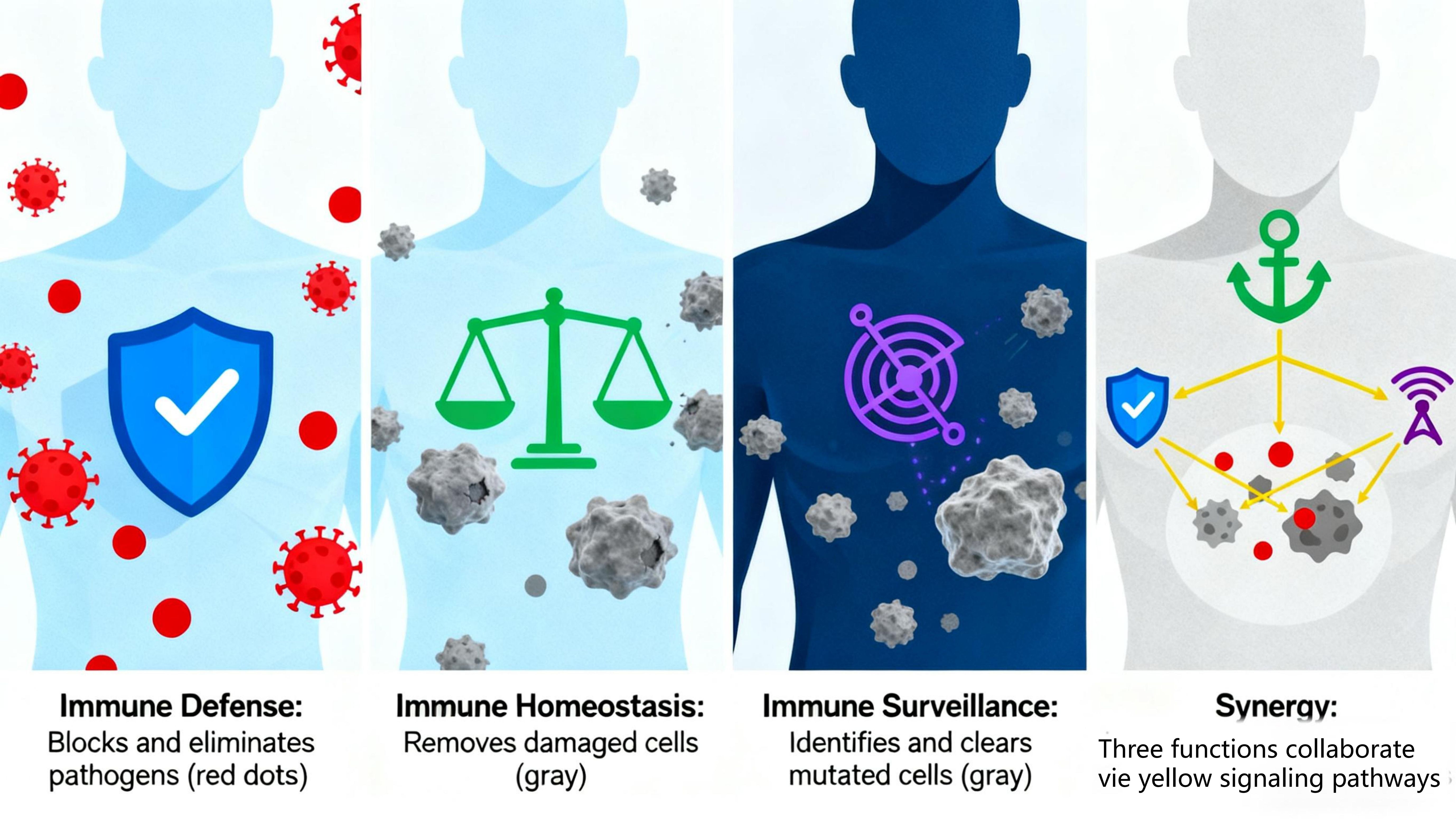 The immune function of the human body is primarily composed of three major functions: immune defense, immune surveillance, and immune homeostasis. These functions are interconnected and mutually influential, collectively maintaining the body’s health. Immune defense serves as the foundation, preventing the invasion of external pathogens and eliminating infiltrated pathogens and other harmful substances. Immune homeostasis acts as a critical safeguard, maintaining internal environmental stability by continuously removing aged, damaged, or denatured self-cells and identifying/eliminating antigenic foreign substances. Immune surveillance is pivotal, enabling the timely detection and elimination of mutated cells and virus-infected cells in the body to prevent tumorigenesis and persistent viral infections. Immune surveillance collaborates with defense and homeostasis: Defense and homeostasis clear pathogens and harmful substances that may induce cell mutation, reducing tumorigenic triggers. Surveillance identifies and eliminates abnormal cells generated by homeostatic dysfunction and virus-infected cells not fully cleared by defense, preventing their progression to tumors or persistent infections. The three immune functions work in close coordination to form a complete defense system. Abnormalities in any function may disrupt others, leading to immune dysfunction and various diseases (Figure 5).