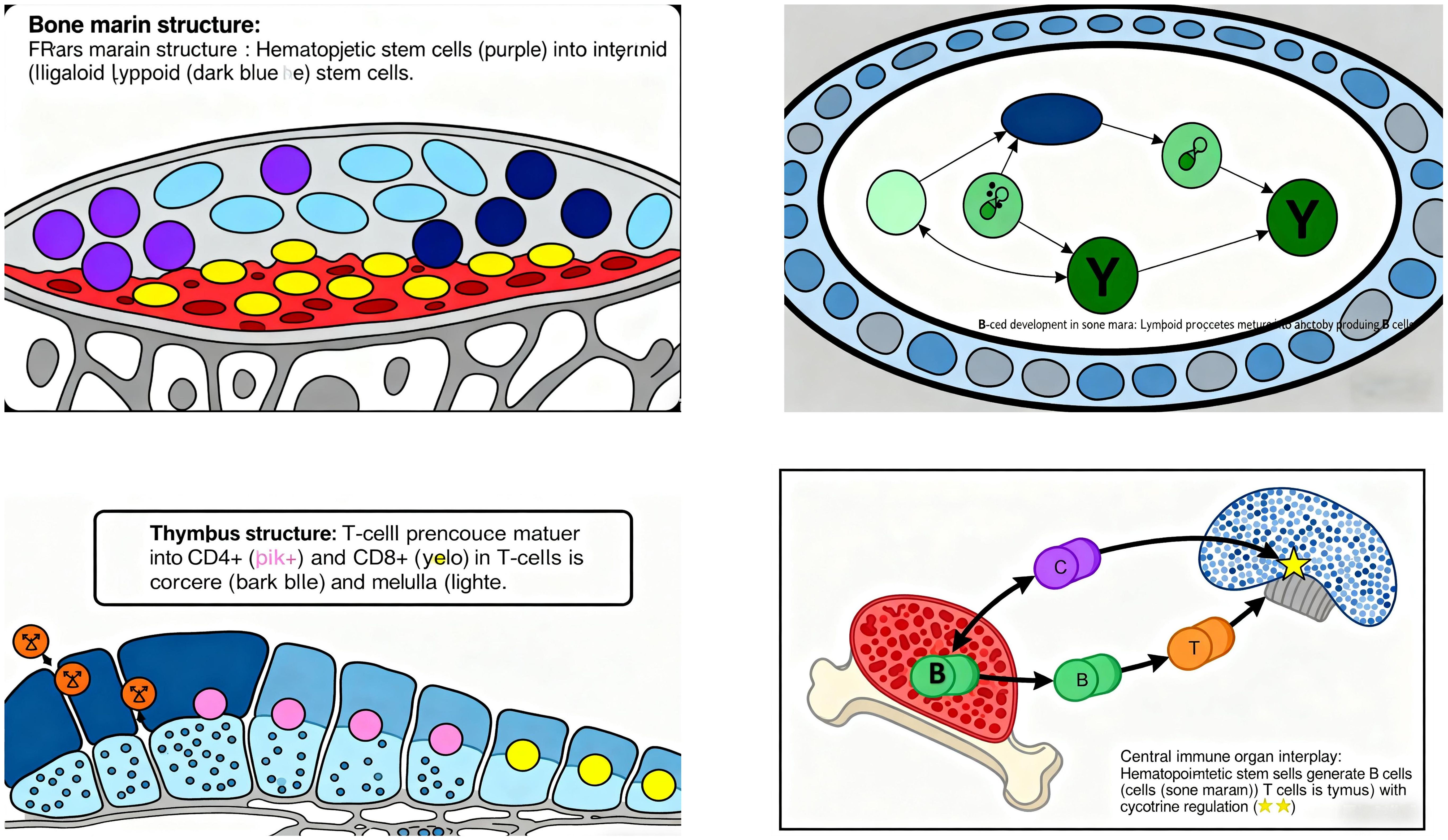 Central immune organs include the bone marrow and thymus: Bone marrow is the site for the generation, differentiation, and maturation of various immune cells, serving as the primary locus for B-cell development. It also produces cytokines involved in immunoregulation. Before and after birth, the bone marrow primarily functions in hematopoiesis, generating precursor cells for all immune cells (including T-cell progenitors). Multipotent stem cells in the bone marrow differentiate into myeloid and lymphoid stem cells: Myeloid stem cells give rise to erythrocytes, monocytes, granulocytes, and megakaryocytes. Lymphoid stem cells develop into B-cell and T-cell precursors, which are central to humoral and cellular immunity, respectively. During B-cell development, lymphoid progenitors mature as they migrate toward the center of the bone marrow cavity (38) (Figure 6).