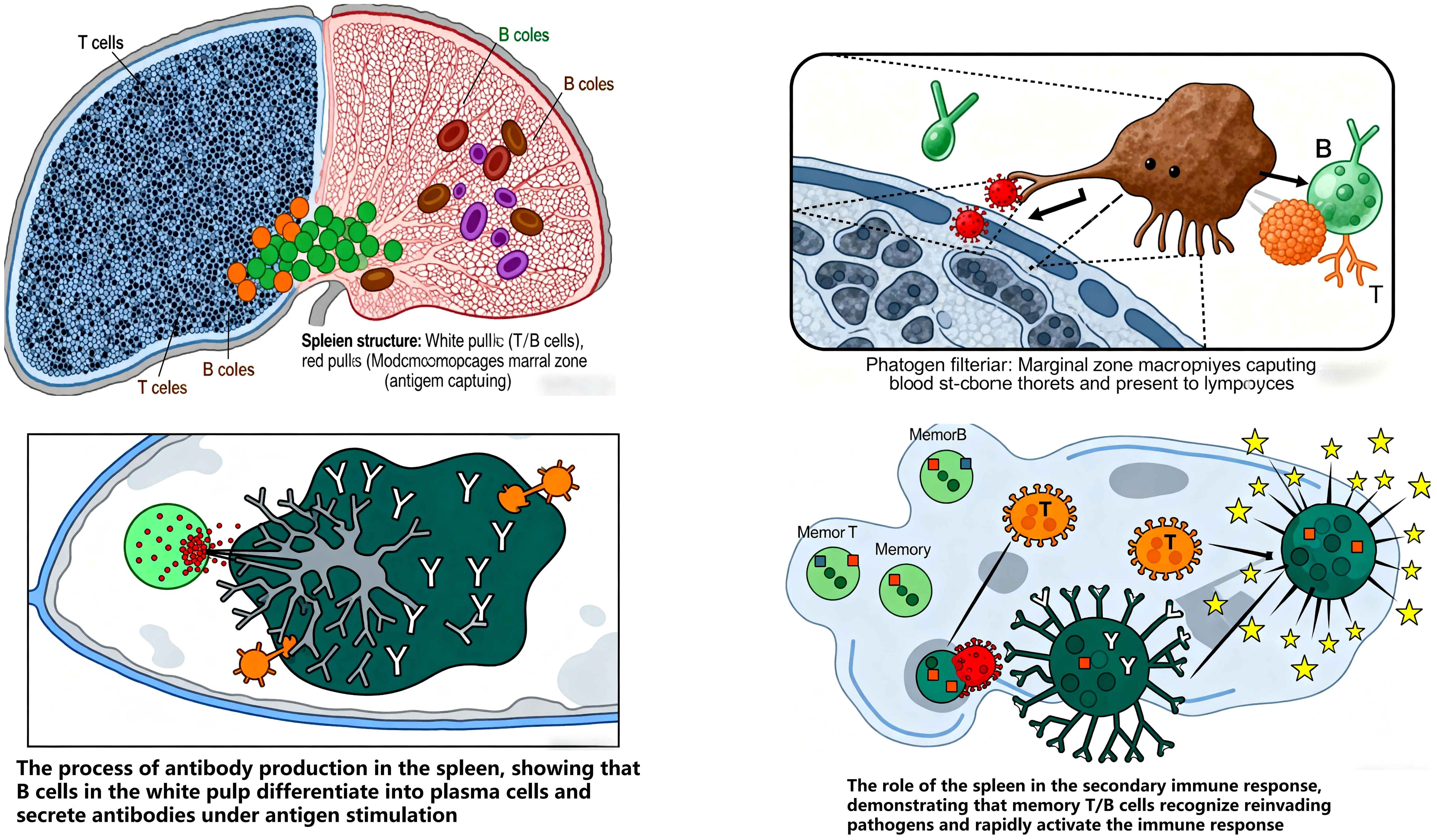 Spleen acts as an immune gatekeeper, initiating and maintaining responses against blood-borne pathogens. It filters pathogens and aged cells, and is central to blood-borne antibody production (45). The spleen index, a key indicator of immune function, reflects lymphoid tissue hyperplasia and lymphocyte activation/proliferation following antigen stimulation, with increased organ weight indicating enhanced immunity (46). Its parenchyma is divided into white pulp, red pulp, and marginal zone: White pulp (dense lymphocytes) is the primary site of specific immune responses. Marginal zone (predominantly B cells with abundant macrophages) captures antigens and initiates immune responses (47, 48). Memory T/B cells are predominantly generated in the spleen, underscoring its role in secondary immune responses (49) (Figure 7).