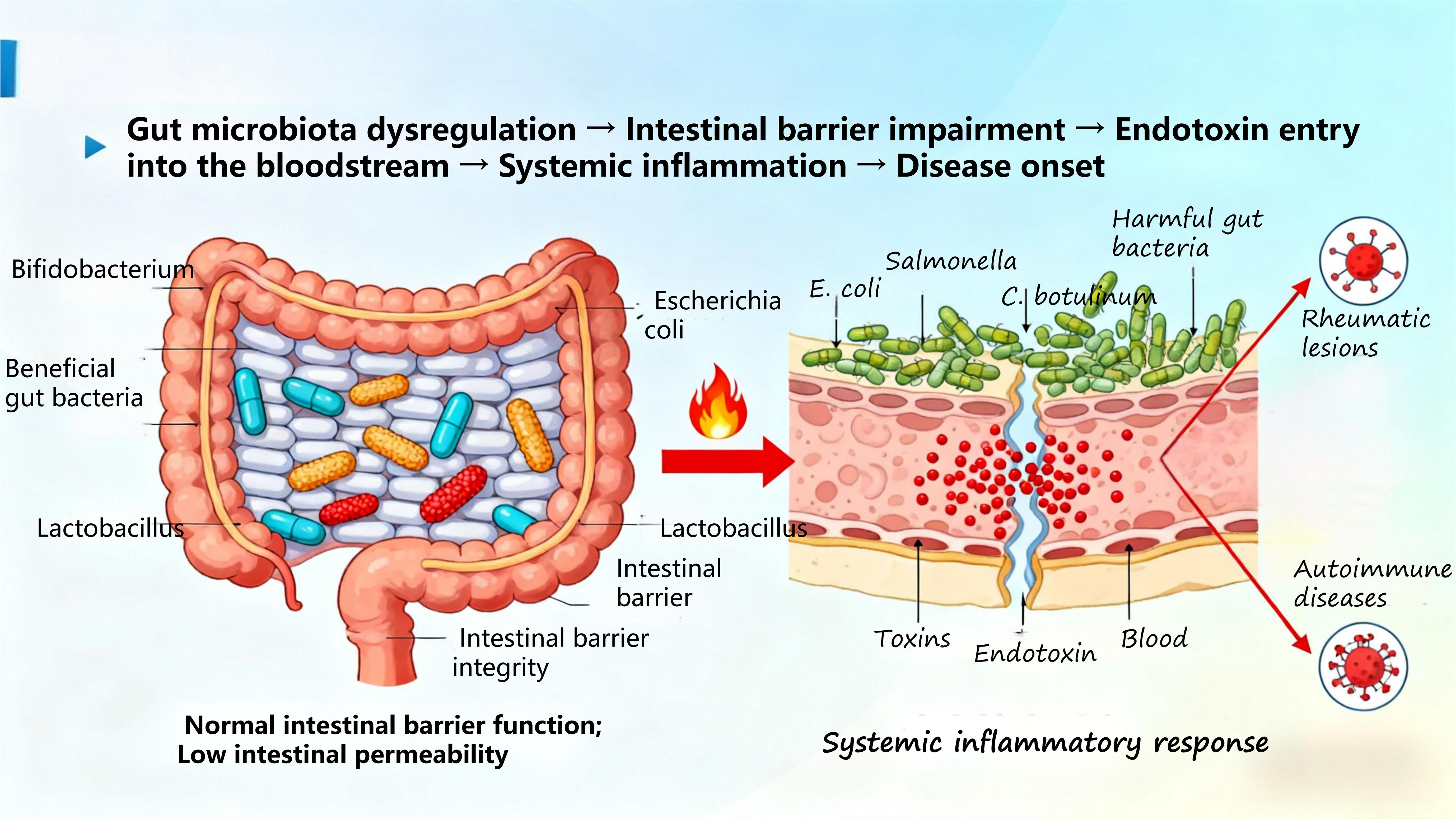 The development of diseases is closely linked to the disruption of bodily homeostasis. In recent years, extensive research has shown (70) that gut microbiome dysregulation participates in all stages of disease development and prognosis by influencing the host immune system and metabolism. Composed of bacteria, fungi, and viruses, the gut microbiome plays a vital role in maintaining the delicate balance of human health (71). Through Mendelian randomization analysis, Hao Sha et al. (72) demonstrated that gut microbiota is associated with autoimmune diseases (ADs), characterized by reduced beneficial bacteria, increased harmful bacteria, and decreased diversity. This imbalance impairs the intestinal barrier, increases permeability, and allows endotoxins to enter the bloodstream, triggering systemic inflammatory responses and ultimately leading to disease onset (Figure 8).
