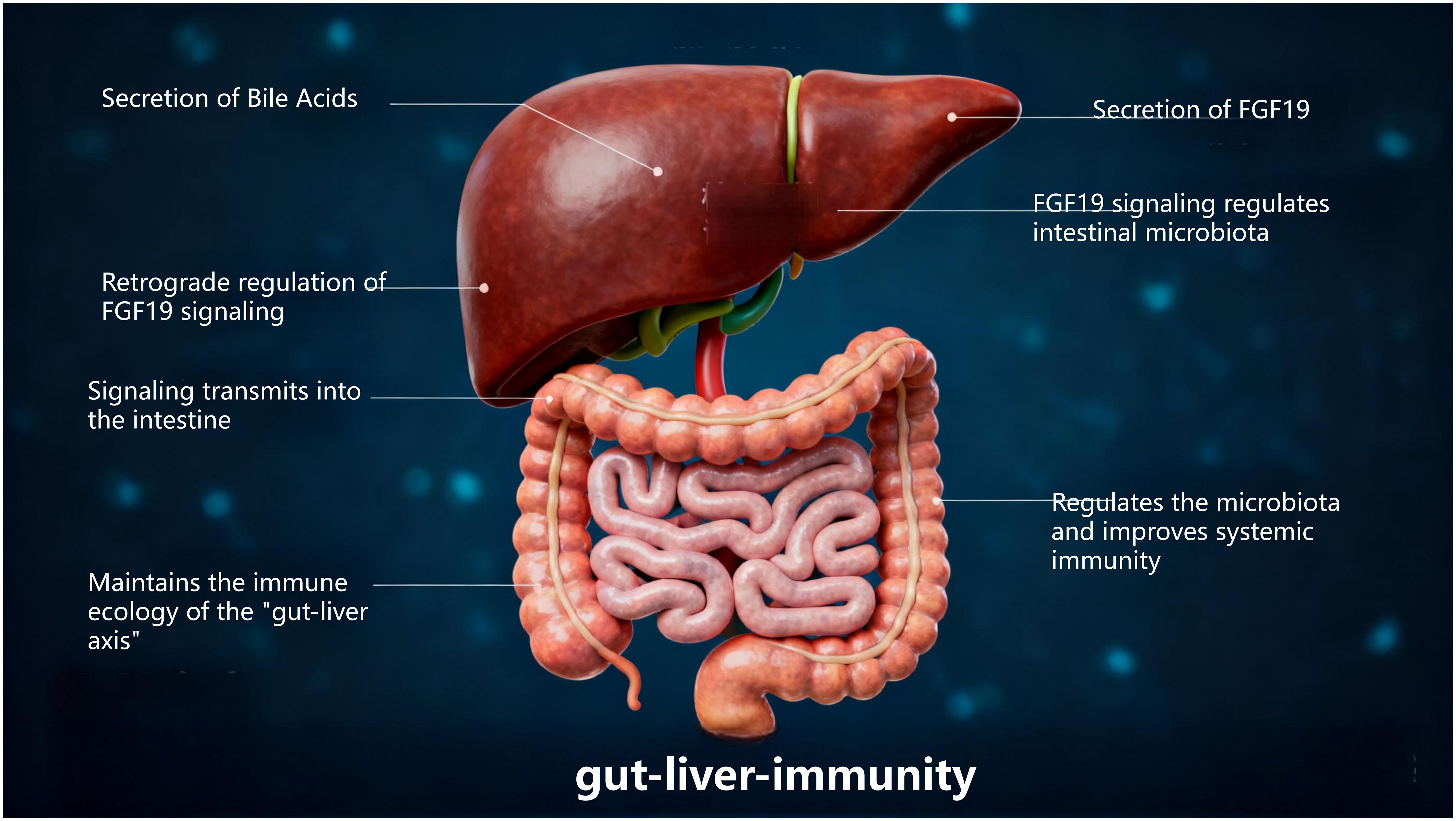 As the core regulatory terminal of the “gut-liver axis”, the liver modulates the composition of intestinal microbiota in a retrograde manner and regulates intestinal as well as systemic immunity either directly or indirectly. This regulation is mediated through pathways including BAs secretion and FGF19 signaling modulation, which collectively constitutes a pivotal feedback regulatory loop for maintaining “gut-liver-immunity” homeostasis (Figure 9).