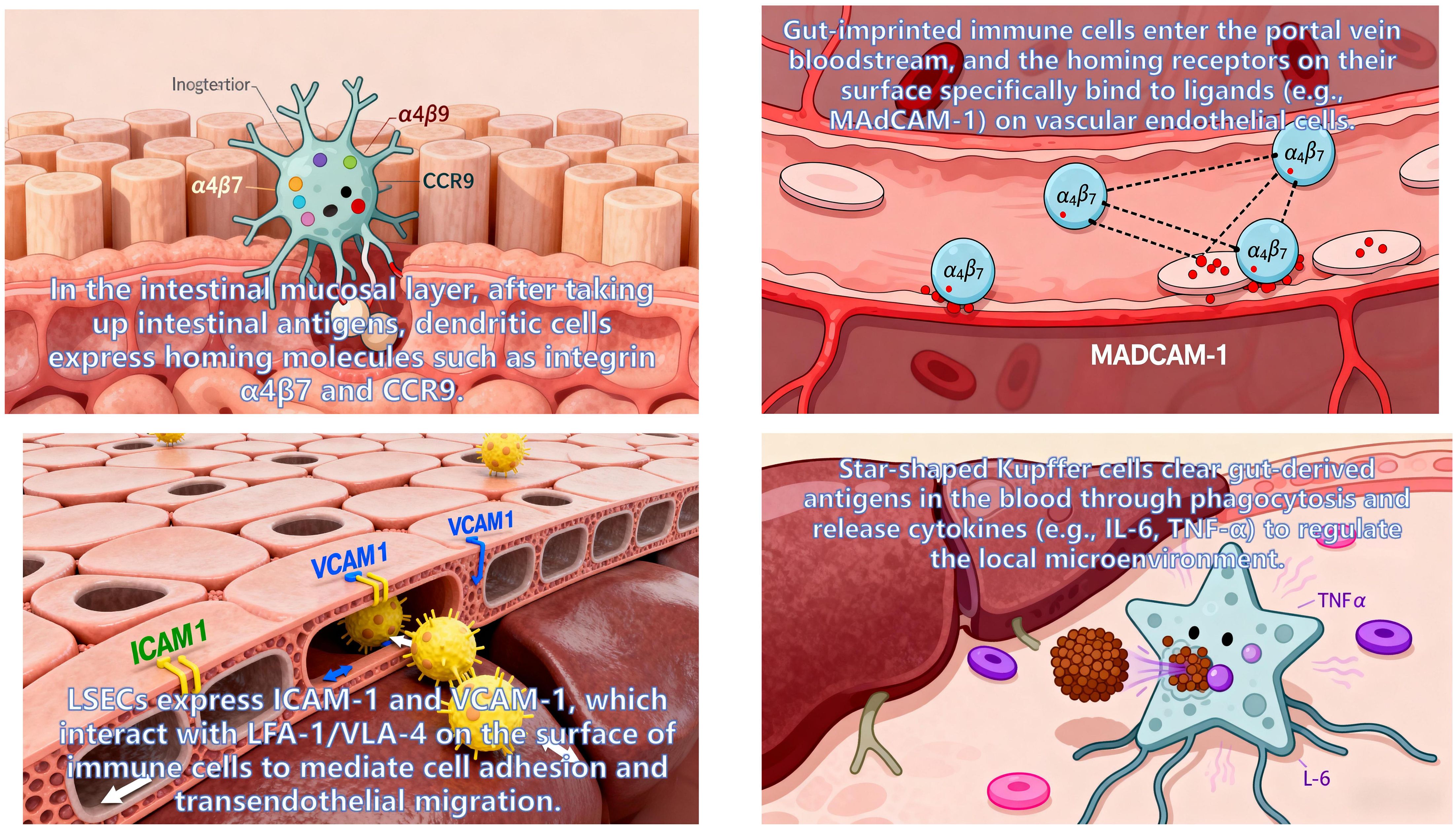 During activation, intestinal immune cells are “imprinted” with specific homing molecules by the intestinal microenvironment. Upon entering the circulation, these cells migrate precisely to distinct hepatic regions via specific interactions with ligands/chemokines on liver tissue, relying on three core pathways: