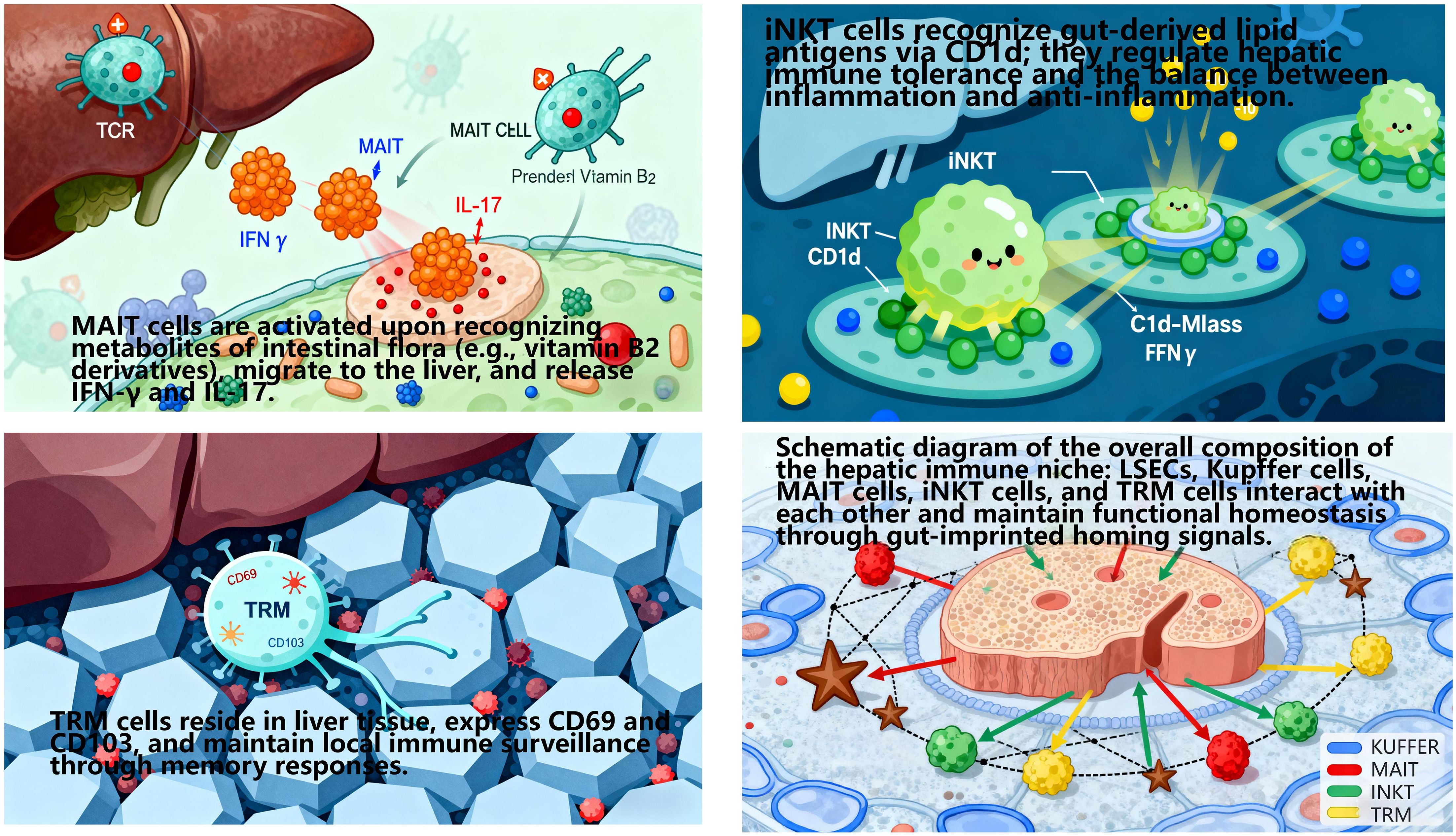 The cross-organ immune coordination of the gut-liver axis does not rely on the generalized recruitment of cytokines/chemokines or random migration of immune cells. Instead, it achieves directional recruitment and functional colonization of immune cells to the liver via gut-imprinted homing signals, thereby shaping a tissue-specific hepatic immune niche (128). This niche comprises liver sinusoidal endothelial cells(LSEC), Kupffer cells, MAIT, iNKT, and TRM (129). Its formation and functional maintenance are highly dependent on the regulation of gut-derived homing molecules—a core feature of gut-liver axis-mediated cross-organ immune regulation (Figures 10, 11).